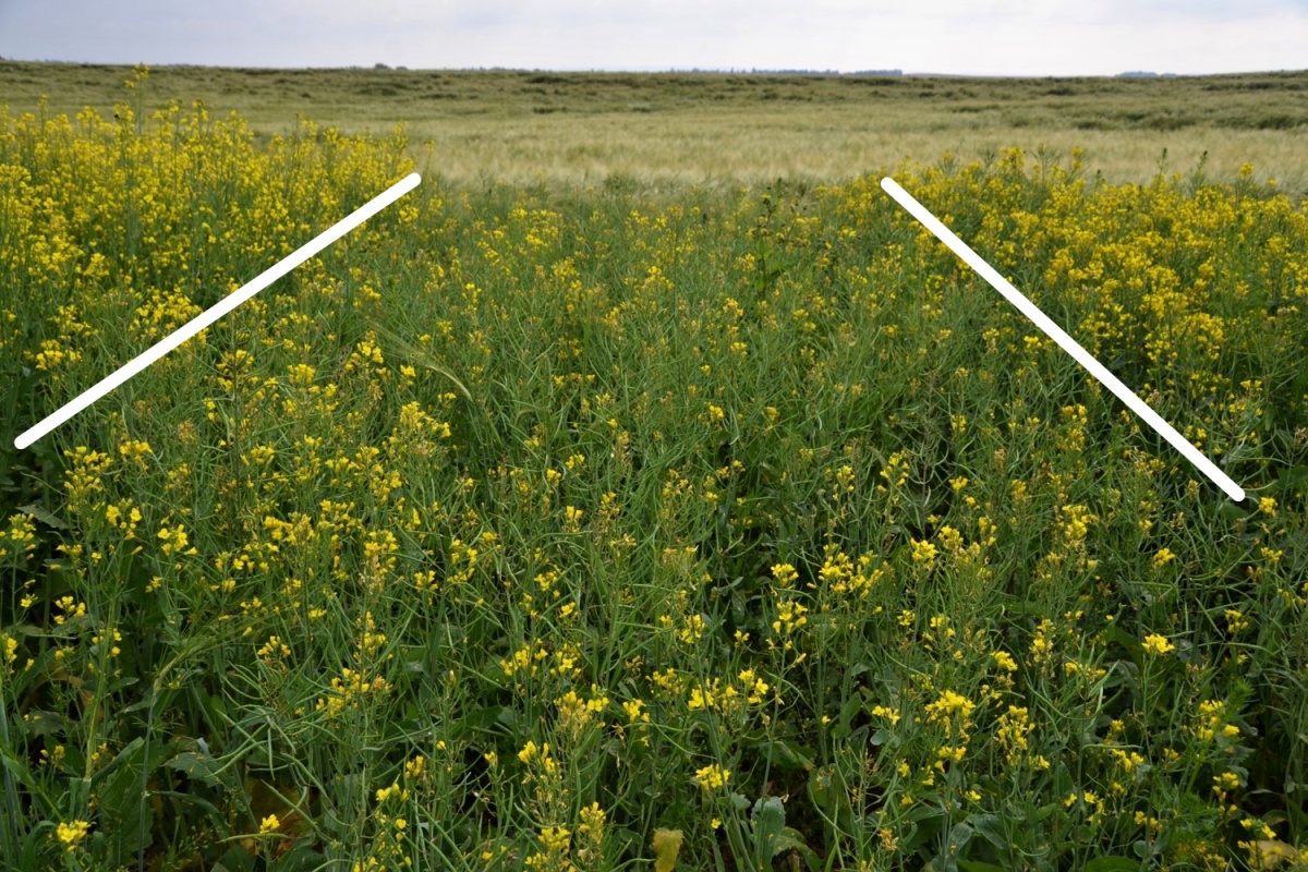 Symptomy zakrslosti v kvetoucím porostu náchylné odrůdy (uprostřed), po stranách rezistentní odrůda