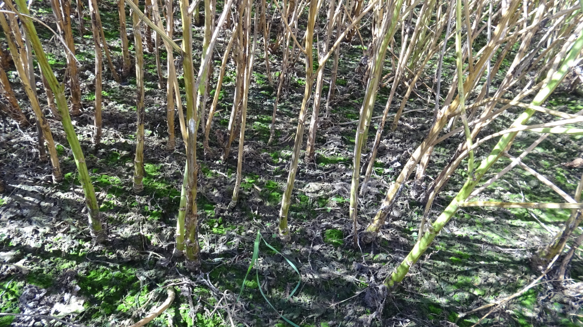 Rostliny řepky s příznaky napadení verticiliovým vadnutím
