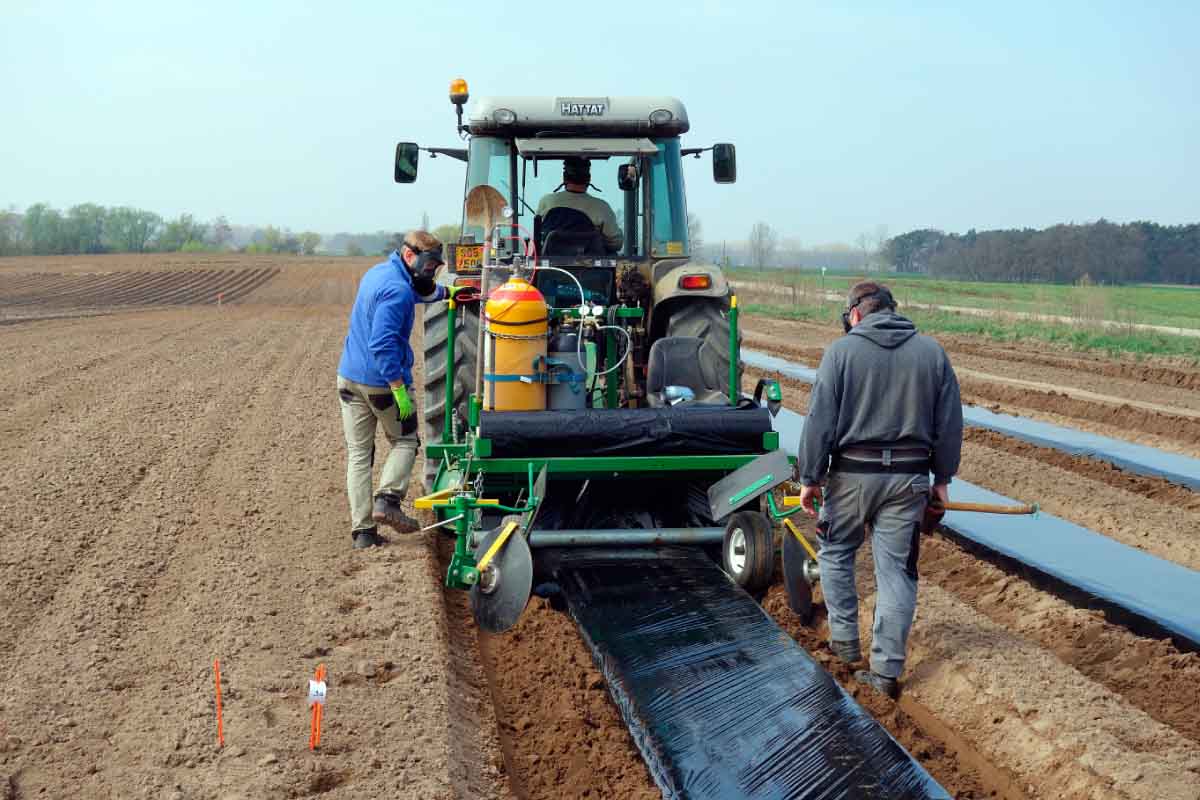 První možností je aplikace pomocí přístroje neseného za traktorem. Aplikátor je vlastně přístroj pro pokládku mulčovací fólie opatřený několika úzkými radličkami s aplikačními hadičkami. EDN je tedy zapraveno do půdy a ta je ihned zakryta plastovou folií, která zamezí úniku přípravku do ovzduší. Ošetřovat se mohou buď jednotlivé řádky, což je ideální pro pěstování zeleniny nebo je možné jednotlivé pruhy folie slepovat k sobě, a tím pádem ošetřit celou potřebnou plochu.