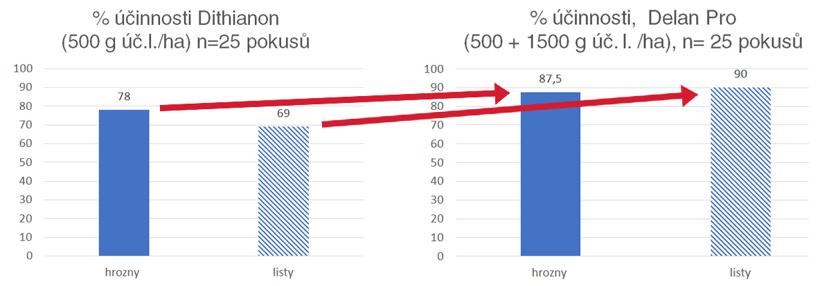 Grafy ukazují účinnost samotné úč. l. dithianon ve srovnání s hotovou kombinací Delan® Pro s fosfonáty draselnými. Fosfonáty draselné výrazně zlepšují fungicidní aktivitu dithianonu a to jak na listech, tak i na hroznech.