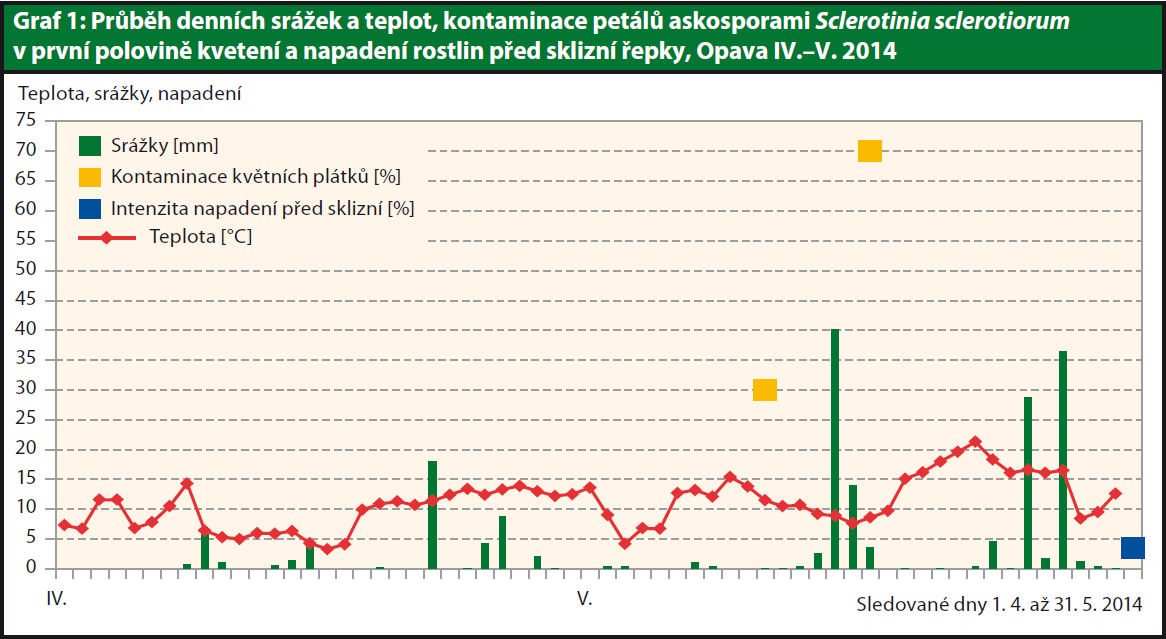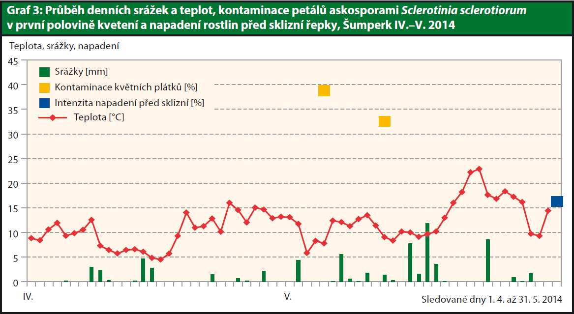 V květnu roku 2014 byly zaznamenány častější dešťové srážky, zejména v první a druhé dekádě měsíce a teplotní křivka z lokality Šumperk až do druhé třetiny kopírovala teplotní křivku lokality Opava. Ke konci května dosahovaly teploty až k 23 °C, což zřejmě přispělo k lepšími rozvoji houbových patogenů v řepce a hodnota napadení neošetřených řepkových porostů bílou hnilobou řepky dosahovala před sklizní 15 %.
