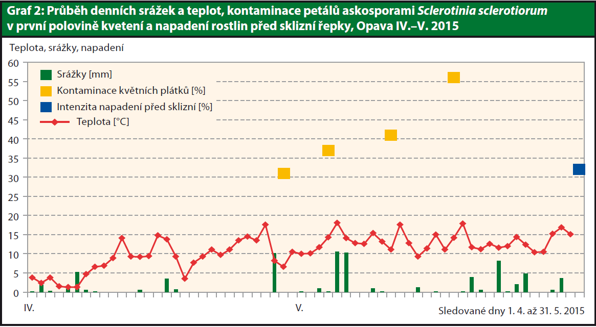 K signalizaci fungicidního ošetření je možné využít hodnocení kontaminace petálů askosporami původce S. sclerotiorum (graf 1 až 4). V těchto grafech je uveden průběh srážek a teplot na počátku vegetace až do tvorby šešulí, dále je uvedena kontaminace petálů askosporami prováděná na lokalitách Opava a Šumperk. V první polovině kvetení byly odebírány petály za účelem stanovení kontaminace askosporami patogena S. sclerotiorum. Kontaminace byla stanovena kultivací petálů na pevné živné půdě. Hodnocení probíhala na fungicidně neošetřených plochách.