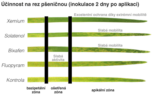 Xemium® je nejnovější účinnou látkou od společnosti BASF. Působí systémově a je rozváděna po celé rostlině. Jakmile se Xemium® vstřebá do rostlinných pletiv, zajišťuje nejen velice rychlou a spolehlivou kontrolu existujících infekcí (kurativně), ale také spolehlivou preventivní ochranu celé obilniny. Obrázek 1 potvrzuje bezkonkurenční preventivní a kurativní účinnost úč. l. Xemium® díky výborné mobilitě v rostlině.