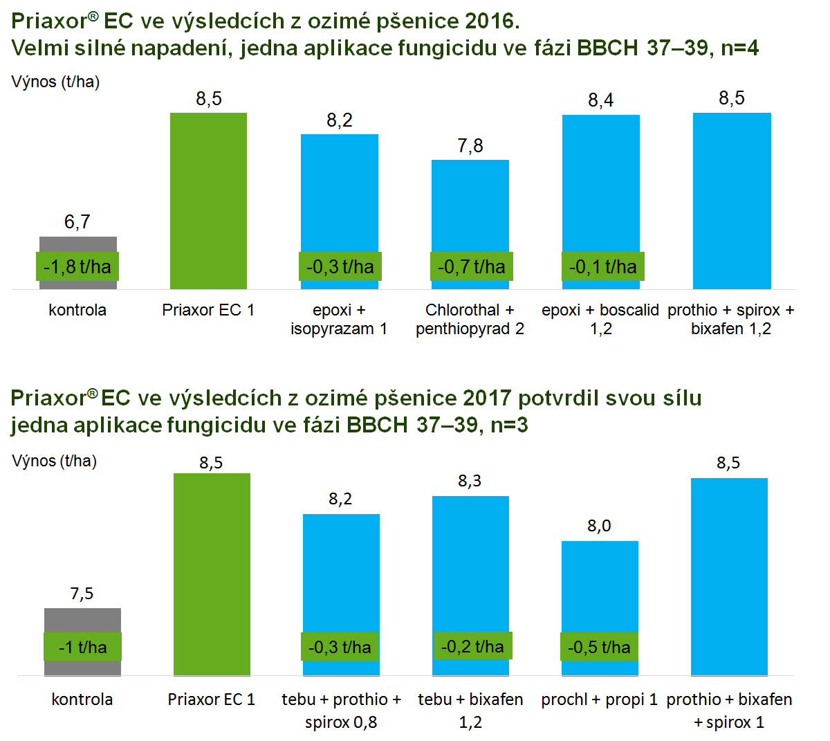 Graf 1 a 2: Priaxor® EC ve výsledcích z ozimé pšenice 2016 (velmi silné napadení chorobami) a 2017