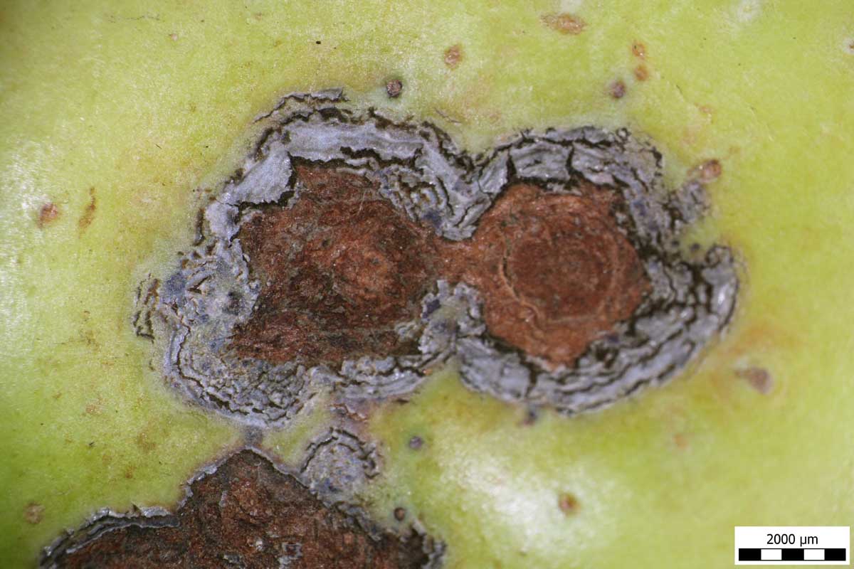 Obr. 1: Příznaky strupovitosti jabloně na plodu