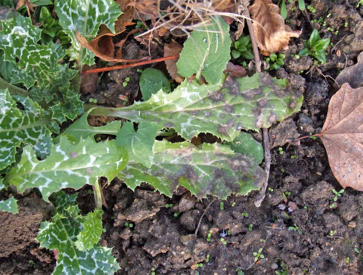 Během vegetace se vyskytují i skvrnitosti listů, jejich původcem je nejčastěji houba Septoria silybi. S. silybi je přenosná osivem a podílí se na padaní klíčních rostlin, případně infikovaná semena špatně či vůbec nevyklíčí. U vzrostlých rostlin houba nejčastěji poškozuje listy tvořící listovou růžici, do nichž hyfy pronikají otevřenými průduchy. Na listech se tvoří kulaté až mírně protáhlé, šedohnědé skvrny se světlejším středem. Z počátku drobné skvrny se mohou slévat do velkých, nepravidelných, nekrotických lézí. Houba vytváří rozmnožovací orgány (pyknidy) na odumřelém pletivu, po obou stranách skvrn. Po ovlhčení jsou z pyknid vytlačovány světle žluté provazce tvořené vláknitými pyknosporami. Za deštivého počasí jsou infikovány i mladé listy na stonku. S. silybi přezimuje na infikovaných posklizňových zbytcích, přezimujících rostlinách a na osivu.