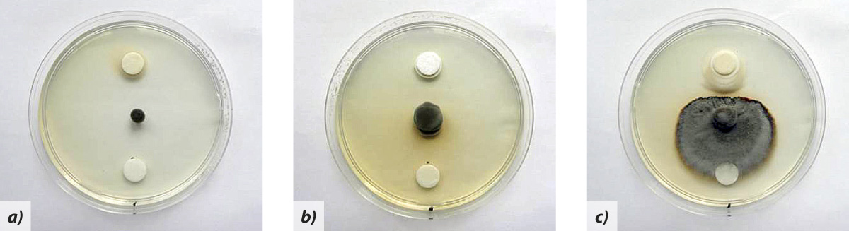 Obr. 3: a) Bumper, b) Efilor, c) Prosaro - horní sterilní terčík ponořen do fungicidu, spodní do sterilní vody - kultura Oculimacula sp. na PDA po 4 týdnech kultivace (18 °C, tma)