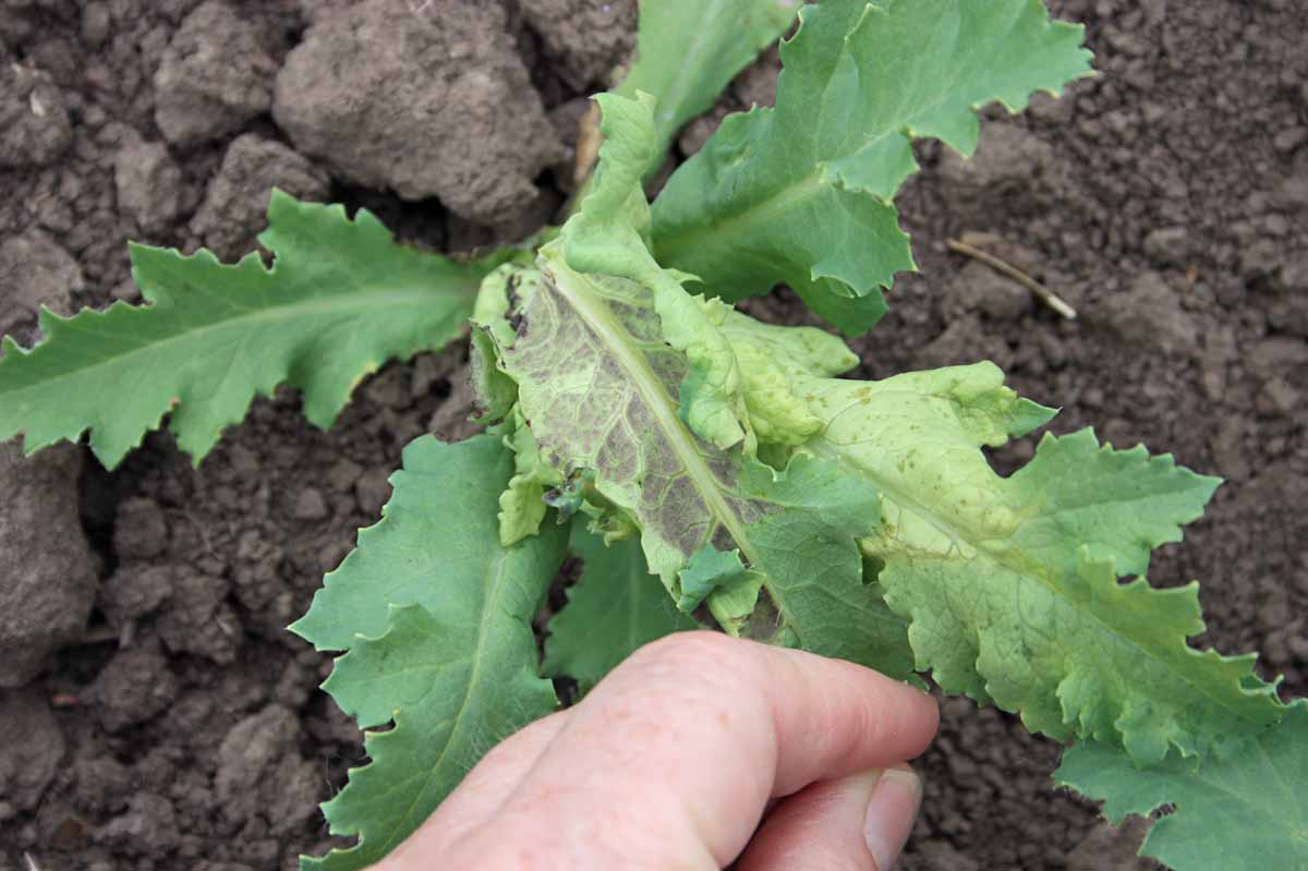 Příznaky plísně máku na rubu listu