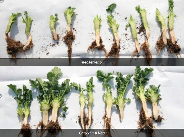 - mírná regulace či ošetření v suchém roce - Caryx® 0,7 l/ha ve fázi 4–6 pravých listů,