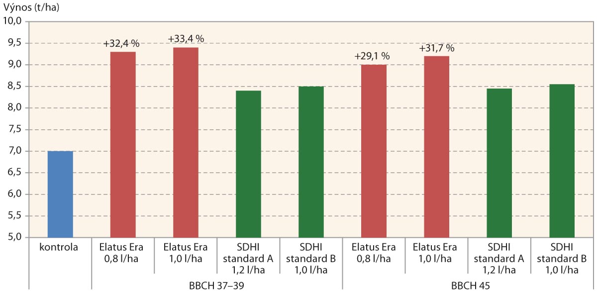 Optimálním termínem aplikace je fáze BBCH 39, při které bylo dosaženo nejlepších výsledků. Doporučená dávka je 0,8 l/ha, která poskytuje perfektní ochranu listu. Na porosty s nejvyšším potenciálem může pěstitel vyskoušet i plnou dávku 1,0 l/ha, která je bezkonkurenční prakticky za všech okolností. Výsledky dokazuje například graf 2, na kterém jsou vidět průměrné výnosové výsledky ze dvou pokusů v ČR z roku 2017 (Trutnov, Velká Bystřice) ve dvou termínech aplikace.