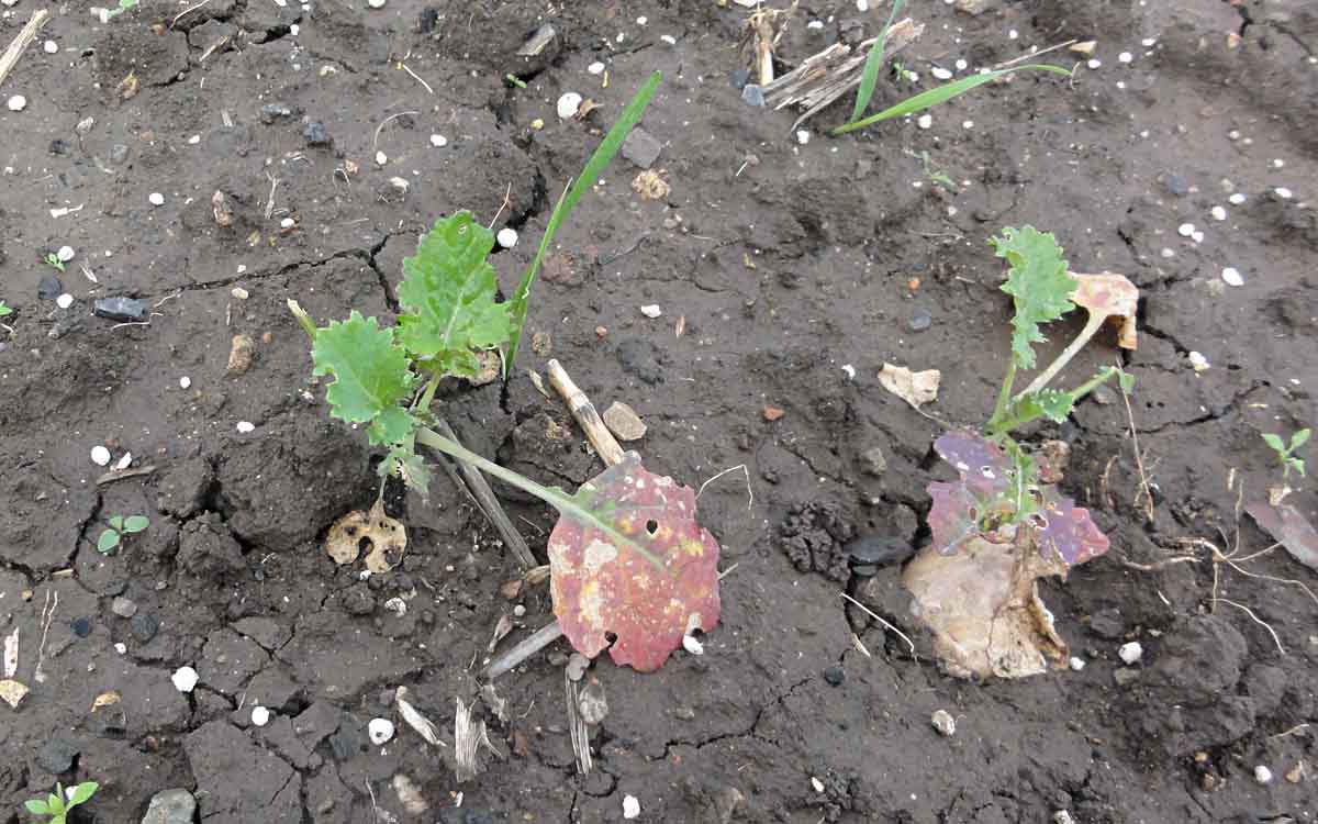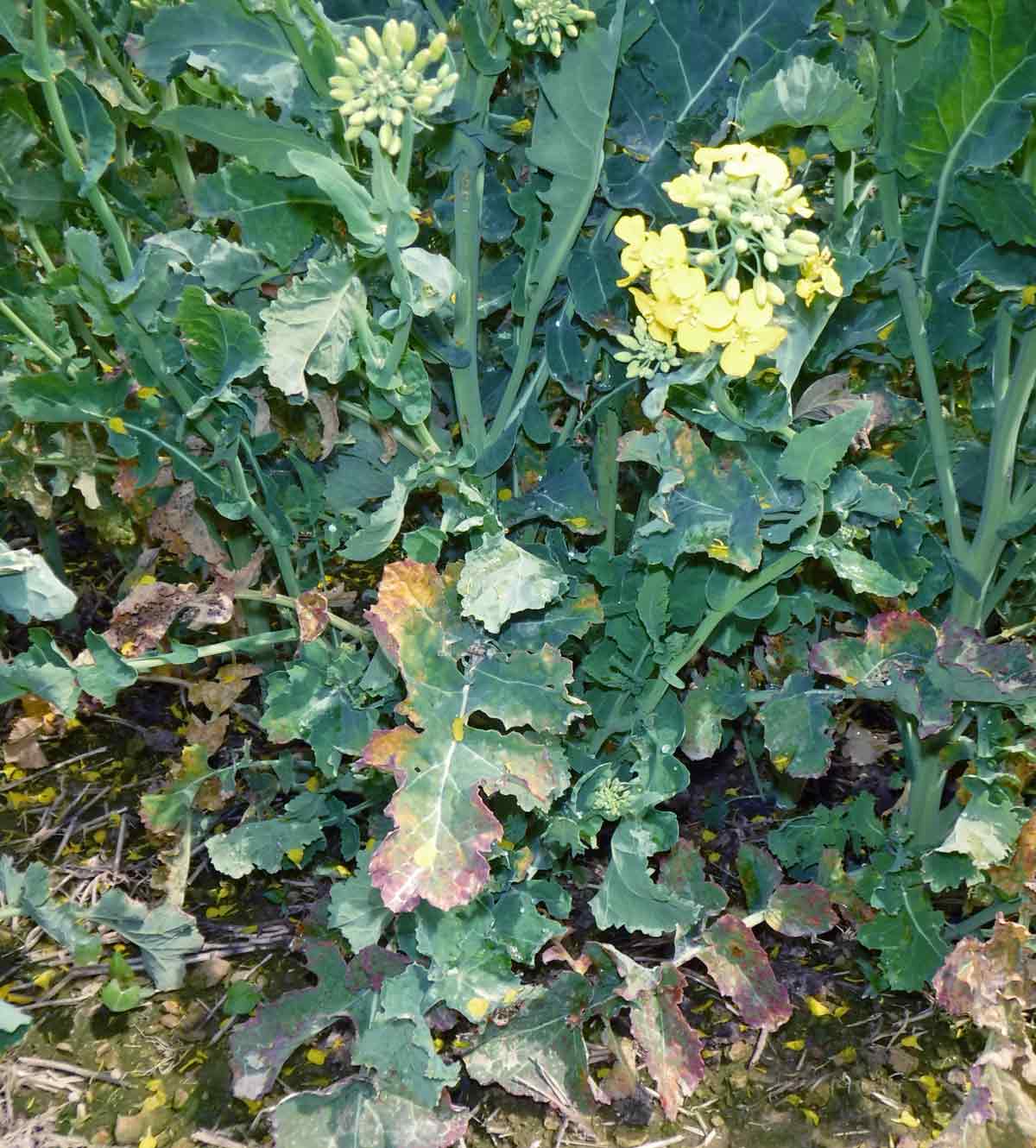 Příznaky viru TuYV na rostlinách řepky