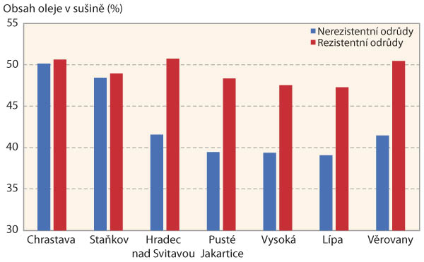 Výsledky jsou shrnuty v grafech 1, 2 a 3, ze kterých vyplývá, že na odrůdách s genem rezistence na všech lokalitách byl v průměru zjištěn nižší obsah viru, výrazně vyšší výnos (až o 13 %) a výrazně vyšší obsah oleje v sušině (až o 8 %).