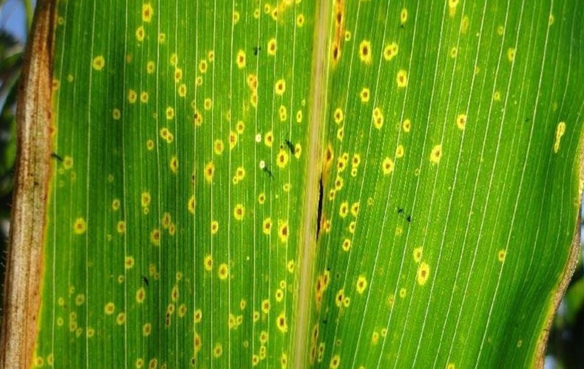 Obr. 4: Projev patogena Puccinia sorghi způsobující rzivost kukuřice