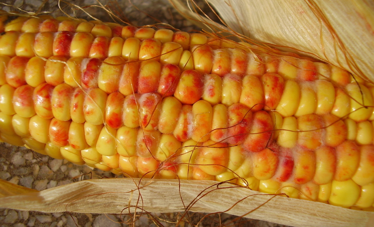 Obr. 5: Bělorůžová hniloba obilek kukuřice (fuzariózy kukuřice) v klasu kukuřice