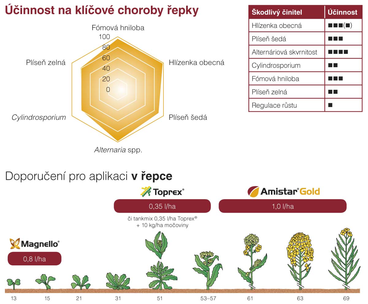 V řepce nyní opět můžeme nabídnout kompletní technologii ošetření. Pro podzimní ochranu a regulaci řepky doporučujeme přípravek Magnello v dávce 0,8 l/ha. Pro jarní regulaci, optimální navětvení a synchronizaci kvetení a dozrávání doporučujeme Toprex 0,35 l/ha v kombinaci s 10 kg/ha močoviny. Amistar Gold je optimálním řešením pro ochranu řepky v květu v dávce 1,0 l/ha.