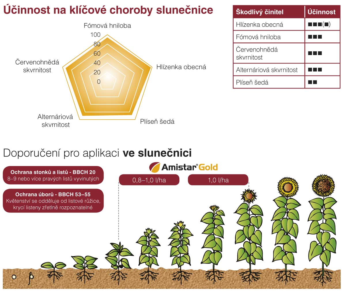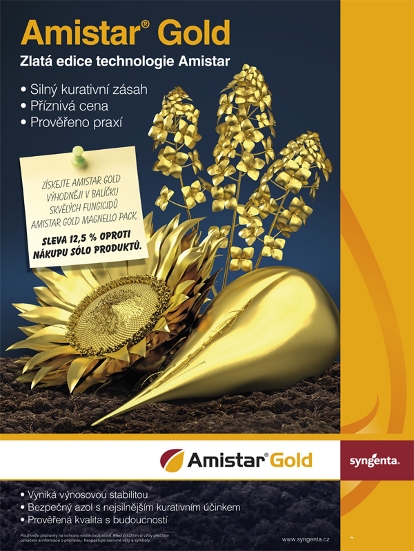 Takovým přípravkem je i nový fungicid Amistar Gold. Širokospektrální fungicid s perfektně vyváženou formulací obsahující technologii Amistar. Je založen na známých a osvědčených účinných látkách a je vyvinut pro ochranu řepky olejky. Na základě zkušeností z praxe byl nastaven optimální poměr účinných látek pro řepku olejku, a to 125 g azoxystrobin + 125 g difenoconazol. Je zde tedy posílena kurativní složka přípravku a účinné látky se tak plynule doplňují v účinku. Bezpečnější použití je zaručeno vyváženou formulací, která byla ušita na míru řepce olejce.