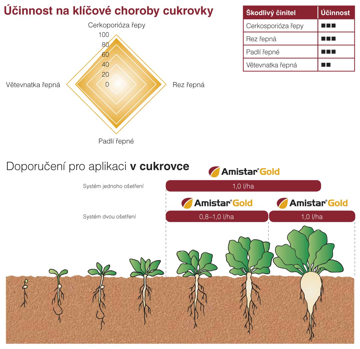 Při ochraně cukrovky můžeme zvolit dva systémy ochrany. V systému jednoho ošetření aplikujeme jednu dávku fungicidu Amistar Gold v dávce 1,0 l/ha. Tento systém ošetření je vhodný za nízkého tlaku chorob. V systému dvou ošetření aplikujeme nejdříve Amistar Gold v dávce 0,8–1 l/ha a následně pak podruhé Amistar Gold v dávce 1 l/ha v závislosti na signalizaci a tlaku chorob.