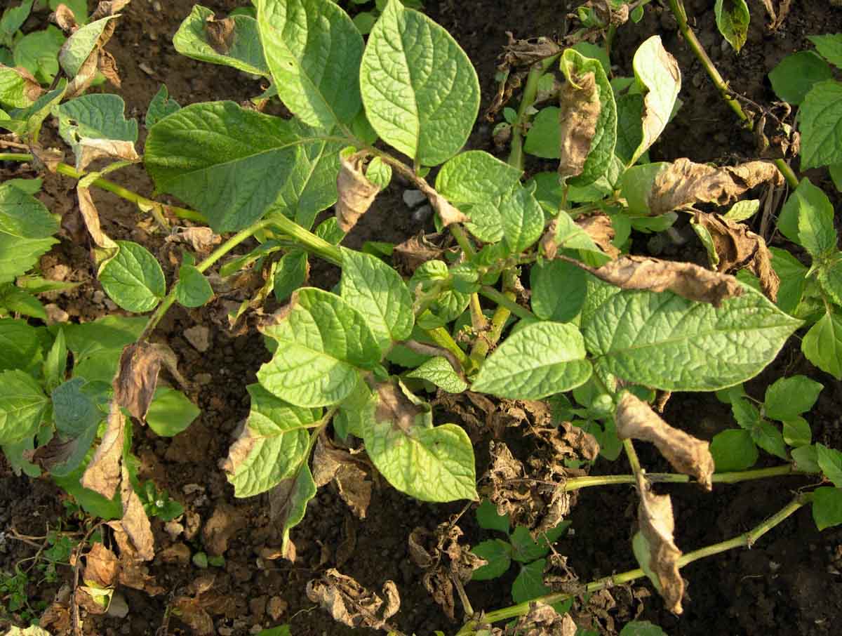 Plíseň bramboru (Phytophthora infestans) je nejvážnější houbovou chorobou, která každoročně poškozuje porosty brambor a rajčat. Choroba přezimuje v napadených hlízách a po výsadbě prorůstá do nadzemní části rostlin. Z těchto primárně napadených rostlin se šíří sporangiemi do okolního porostu. Inkubační doba od infekce rostliny do objevení se příznaků napadení je v průměru 1 týden. Rozhodujícím faktorem ovlivňujícím celkovou účinnost a efektivnost ochrany proti této chorobě je termín prvního ošetření. Obvykle je důležitější než výběr konkrétního přípravku a než celkový počet ošetření. Fungicid by měl být na listech v době před dopadem spor původce plísně. Pokud tomu tak není a dojde k infekci, nelze již šíření plísně v zapojeném porostu zcela zvládnout ani velmi intenzivní ochranou! Toto pravidlo platí i u všech dalších pravých plísní - okurkové, cibulové, révové, chmelové atd. Základem ochrany proti této chorobě je proto včasná - preventivní - aplikace fungicidů. Porosty je nezbytné začít ošetřovat v době, kdy jsou vytvořeny vhodné mikroklimatické podmínky pro infekci a pokračovat v pravidelných intervalech 7 až 14 dnů podle počasí a napadení natě. Obvyklá fáze pro první aplikaci je uzavření porostu v řádcích. Četnost ošetření a druh přípravku se řídí „infekčním tlakem“ - stupněm ohrožení (podle množství dešťových srážek), který je pravidelně zveřejňován na eagri.cz a je možno se informovat také na místně příslušných pracovištích ÚKZÚZ. Aby bylo ošetření dostatečně účinné, nesmí se šetřit vodou, dávka vody u všech fungicidů by neměla být nižší než 400 l/ha. Musí se ošetřit zejména spodní části rostlin, protože tam jsou pro vývoj choroby podstatně lepší vlhkostní podmínky než na povrchu. To platí nejenom pro kontaktní přípravky, ale i pro přípravky působící systémově. Účinná látka většiny systémových přípravků po přijetí rostlinou postupuje především zdola nahoru k vegetačnímu vrcholu (akropetálně) nebo od středu k okraji listů a každé ošetření má jen omezenou dobu účinnosti. Přitom čím je infekční tlak větší, tím kratší dobu chrání fungicidní látka rostlinu před napadením. Značné poškození listů a výnosové ztráty nejsou jediné škody, které tato houba způsobuje. Pokud dojde k infekci hlíz, nedají se déle skladovat. Neboť mohou být napadeny i sekundárními infekcemi bakteriemi rodu Erwinia a houbami rodu Fusarium - skládkovými patogeny, kteří vstupují do hlíz v místech poškození plísní bramboru. K infekci hlíz plísní bramboru může docházet již během vegetace v případě, že jsou sporangia z listů spláchnuta dešťovou vodou do půdy na zdravé hlízy. Spory potom mohou proniknout ještě neuzavřenými lenticelami do zásobního pletiva, a tak hlízy infikovat. Většinou však k infekci dochází trhlinami ve slupce a poraněními, která vznikají při sklizni a naskladňování. Rozsah infekce hlíz kromě jiného závisí na napadení listů, množství a četnosti dešťových srážek, a také na uložení brambor v hrůbku. Z toho vyplývají některá preventivní opatření, která mohou omezit výskyt plísně bramboru. Mezi ně patří např. pečlivé zakrytí hlíz v hrůbku půdou, a také závěrečné ošetření přípravkem inhibujícím spory (např. Altima 500 SC, Zignal). Významnou roli v prevenci proti plísni bramborové hraje také desikace natě, která by se měla uskutečnit zhruba 3 až 4 týdny před sklizní. Během tohoto období ztrácejí spory infekční potenciál, takže při sklizni není potřeba se obávat nové infekce. Předčasným ukončením vegetace se mimo jiné zlepšuje vyzrálost hlíz, zpevňuje se slupka, snižuje se mechanické poškození, a tím se zlepšuje skladovatelnost a odolnost vůči skládkovým chorobám. Sklizeň by měla proběhnout s minimálním poškozením hlíz a je potřeba vyvarovat se sklizně za deštivého počasí. Při naskladňování by měly být zajištěny podmínky pro hojení poranění (teplota okolo 15 °C).