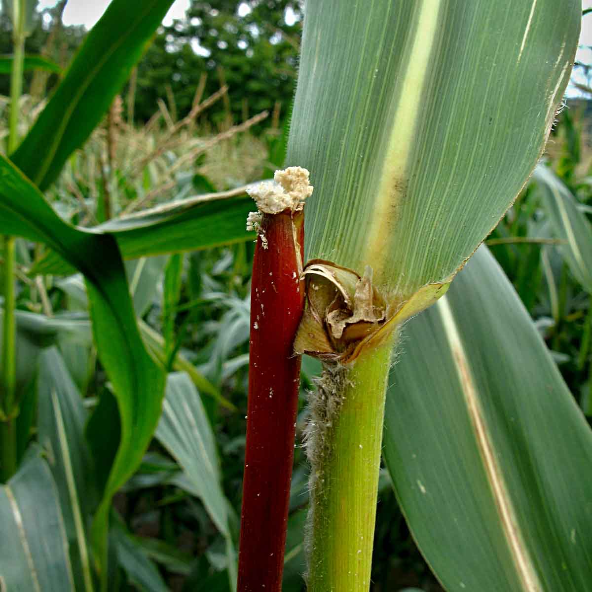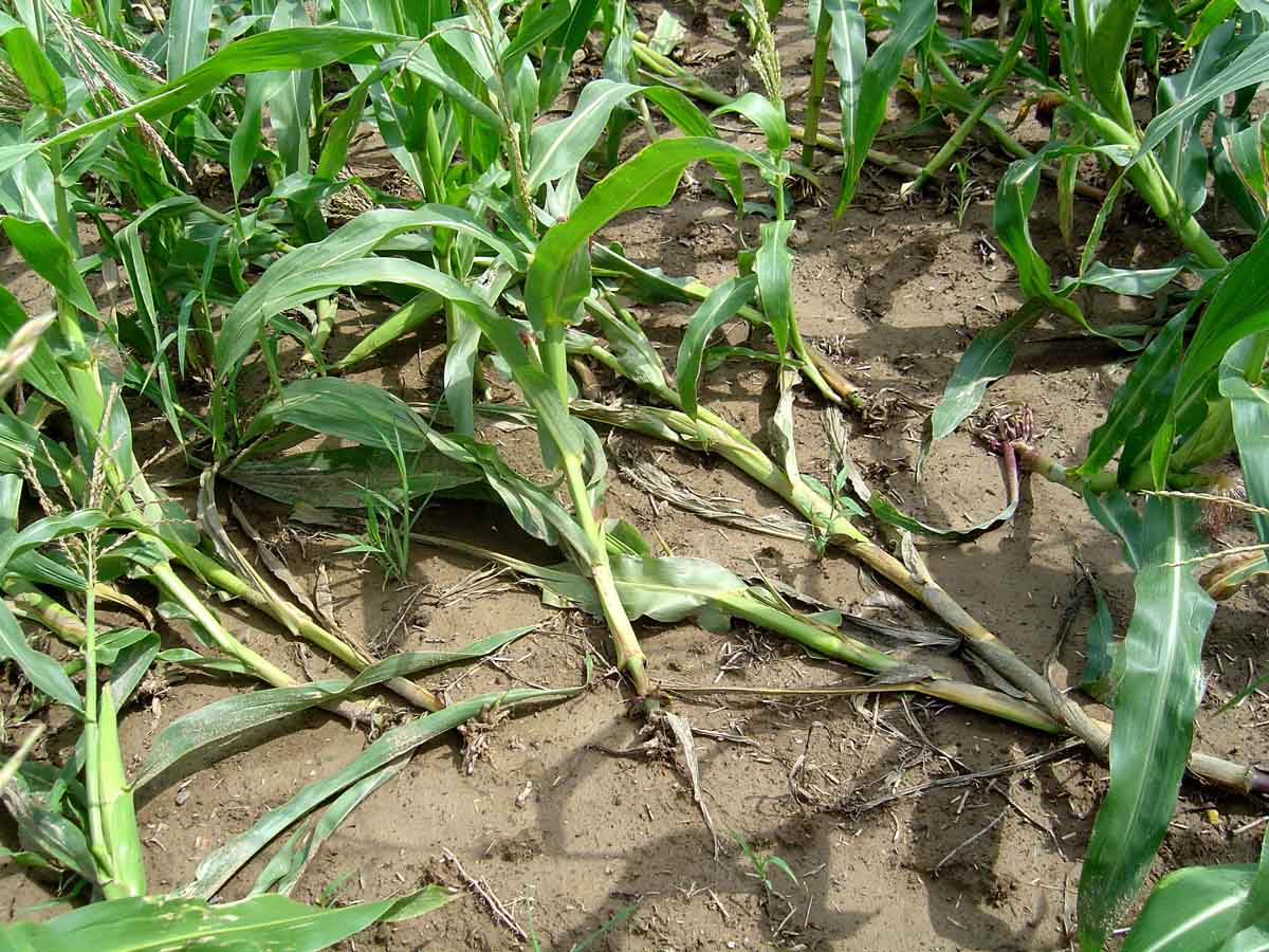 Bázlivec kukuřičný – „husí krky“ po žíru larev na kořenech