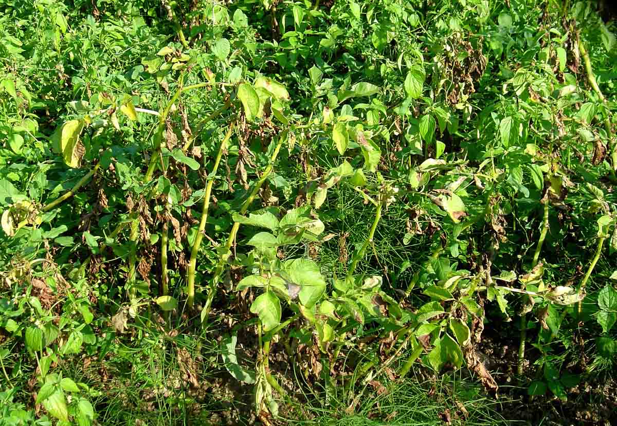 Při přeháňkovém průběhu počasí pokračuje šíření plísně bramboru (Phytophthora infestans) a někde i hnědé/terčovité skvrnitosti listů (Alternaria alternata, A. solani) ve všech porostech.