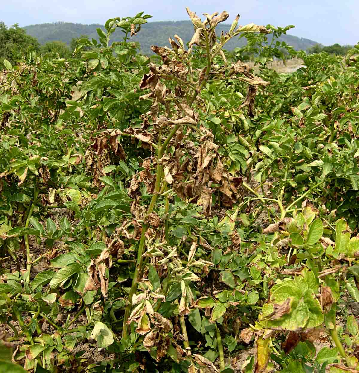 Při přeháňkovém průběhu počasí pokračuje šíření plísně bramboru (Phytophthora infestans) a lokálně i terčovité a hnědé skvrnitosti listů (Alternaria solani, A. alternata).