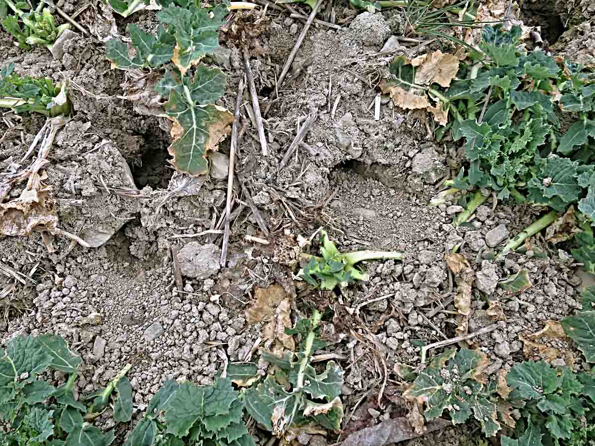 Aktivní nora hraboše polního v ozimé řepce