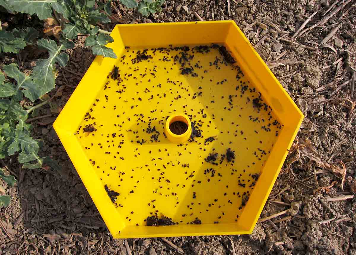 Intenzitu výskytu brouků zjišťujeme 2× týdně pomocí žlutých Mörickeho misek (naplněných vodou s přídavkem smáčedla) nebo žlutých lepových desek. Misky nebo lepové desky je potřeba umístit do porostů (zejména pro sledování krytonosce řepkového) včas - již od dosažení teploty 6 °C. Nálet brouků může být na jednotlivých plochách dosti nepravidelný i v rámci jednoho podniku a po hromadném přeletu brouků ze zimovišť se již v miskách odchytí jen velmi malé procento brouků škodících v porostu! První výskyty bývají nejčastěji na pozemcích s jižní expozicí. Proto je jistější souběžně s monitoringem v miskách kontrolovat i napadení rostlin přímo při důkladné prohlídce porostů.