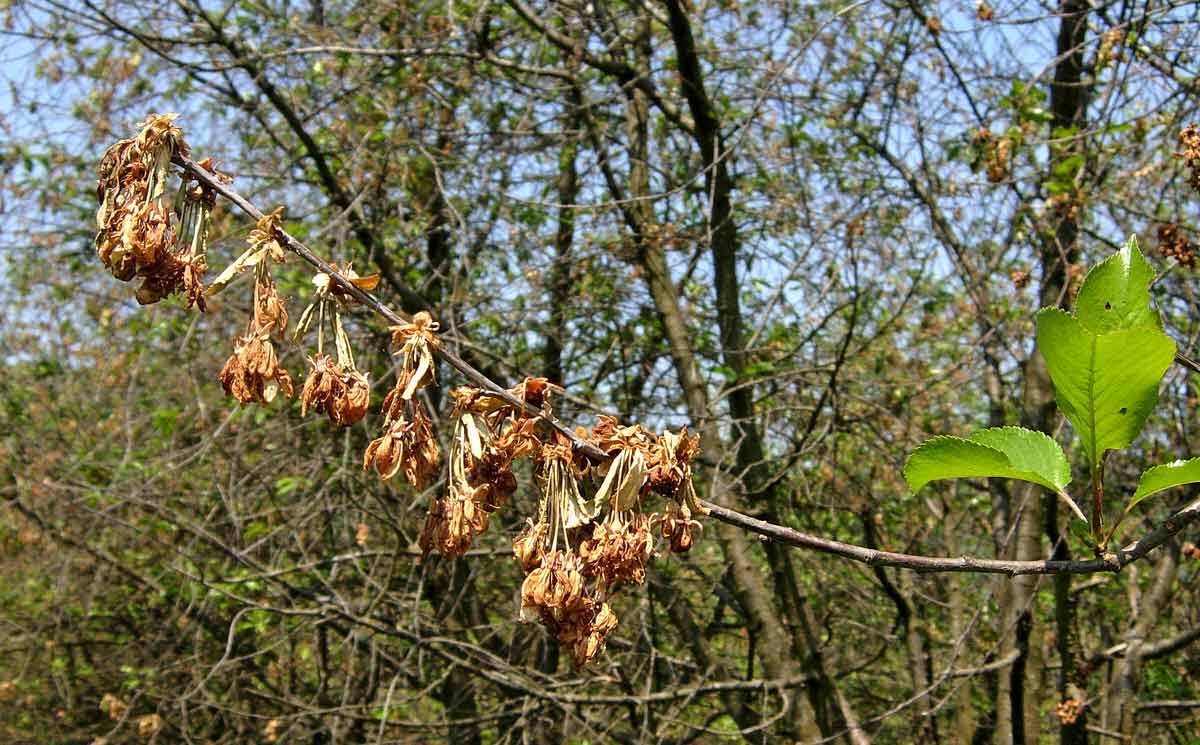 Všeobecně peckoviny, zejména meruňky a višně, jsou napadány v květu houbou Monilinia laxa způsobující moniliniovou spálu. Při silném infekčním tlaku může být zničeno až 100 % květů a houba může následně poškozovat i letorosty a prorůstat i do kosterních větví. Jednotlivé květy, plodné větévky nebo i celé větve hnědnou a zasychají, jsou jakoby spálené a uschlé zůstávají v korunách stromů až do konce vegetace. Při silnější infekci se na postižených letorostech často tvoří klejotok a rakovinné ranky, které jsou vstupní branou pro další dřevokazné mikroorganizmy. Vznik infekce a vývoj moniliové spály je závislý na průběhu počasí v době kvetení stromů. Příznivé podmínky pro vznik onemocnění vytvářejí dešťové srážky nebo jen vysoká vzdušná vlhkost ve spojení s nižší průměrnou denní teplotou (pod 12 °C). Houba přezimuje v napadených částech rostlin, zejména v mumifikovaných plodech, z nichž se na jaře uvolňuje ohromné množství spor.