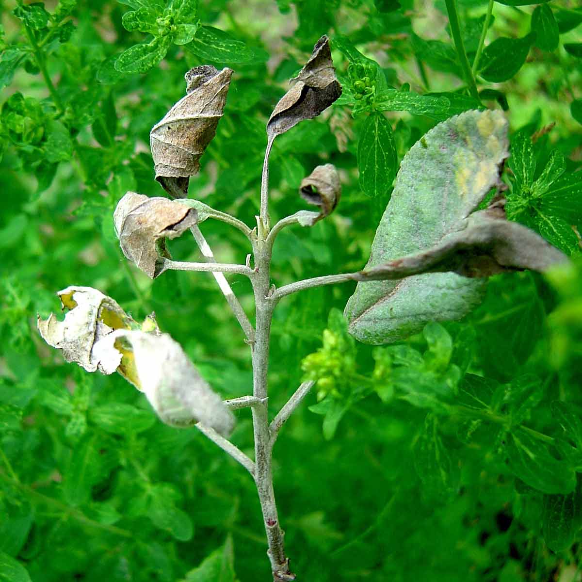 - 3 a více listožravých housenek (pupenových obalečů - růžička listů je sbalena a opředena);