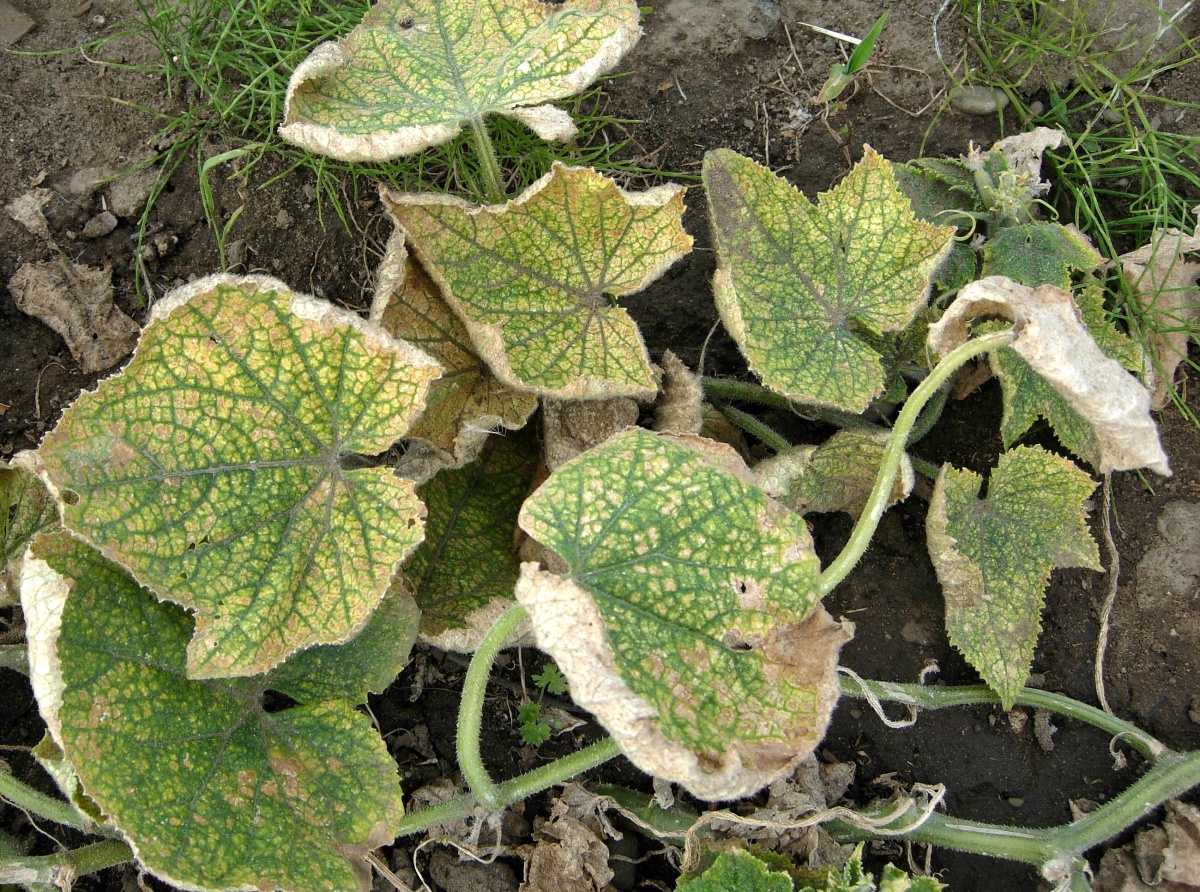 Poškození listů okurky sviluškou chmelovou