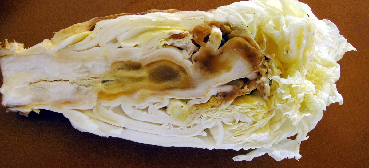 Příznaky deficience vápníku na čínském zelí