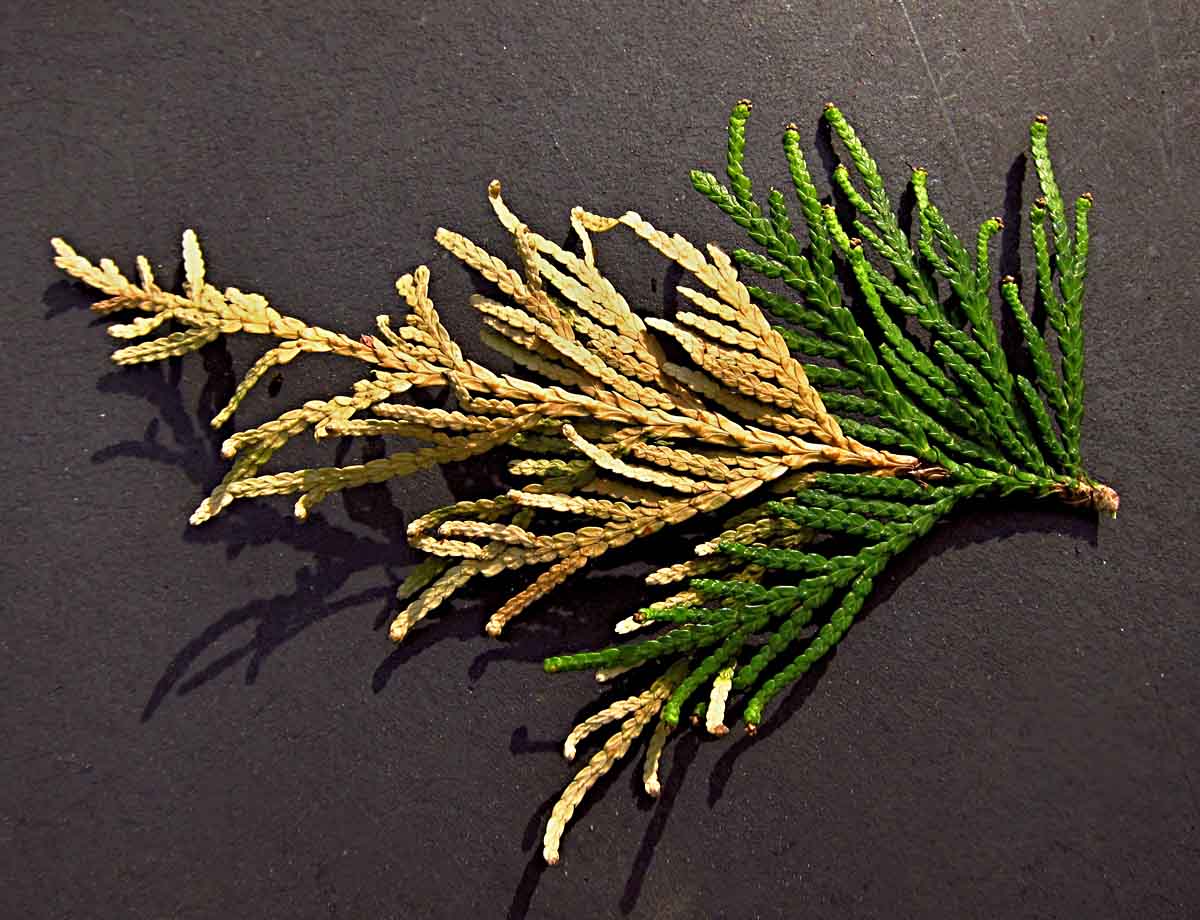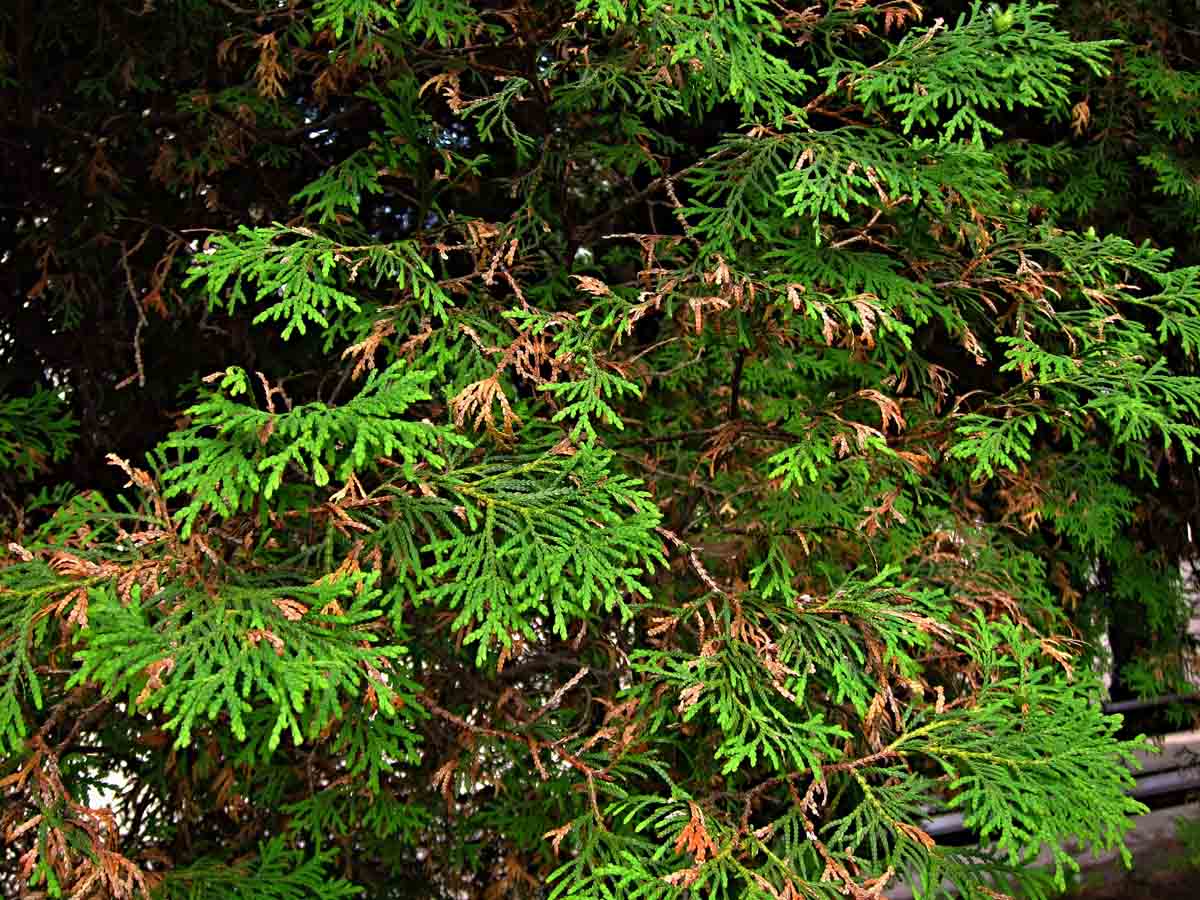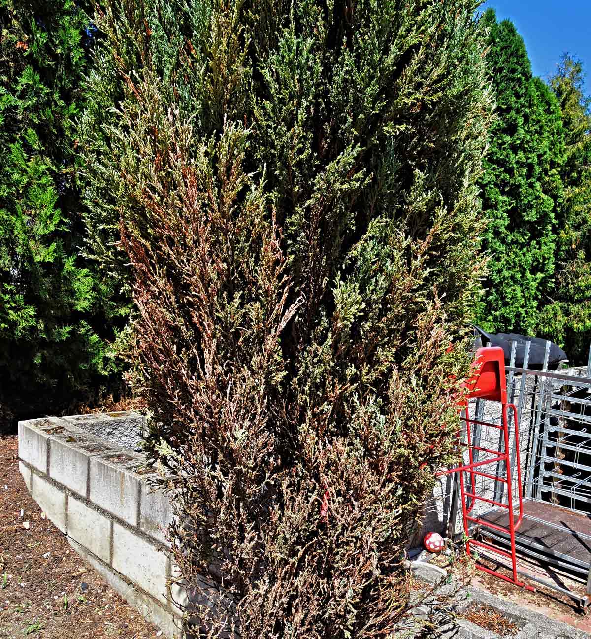 Túje poškozené suchem a sviluškami