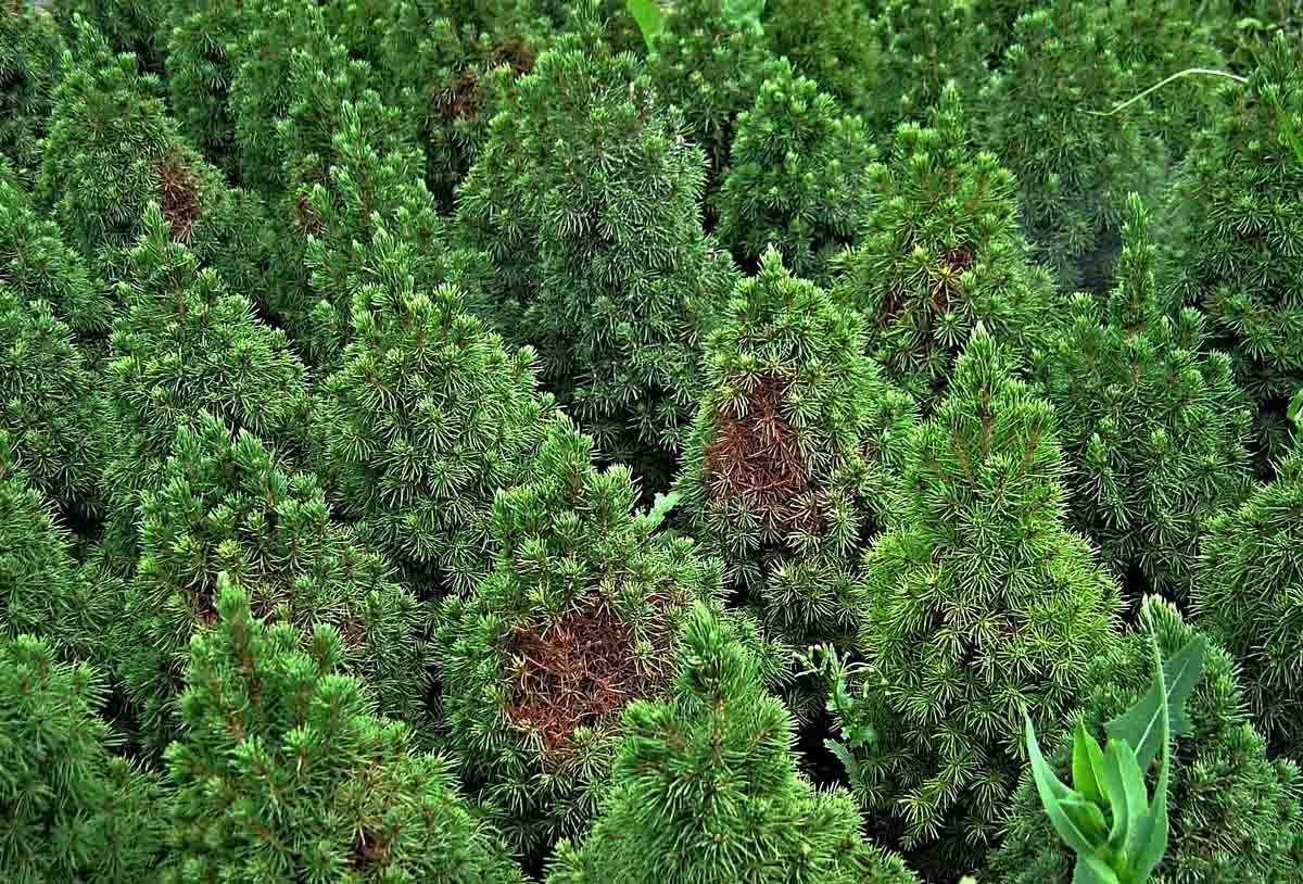 Hnědnutí a prosychání větví jehličnanů (na slunných stanovištích) může způsobovat i napadení sviluškami. V tomto případě aplikujte některý z akaricidů: Nissorun 10 WP či Vertimec 1.8 EC.