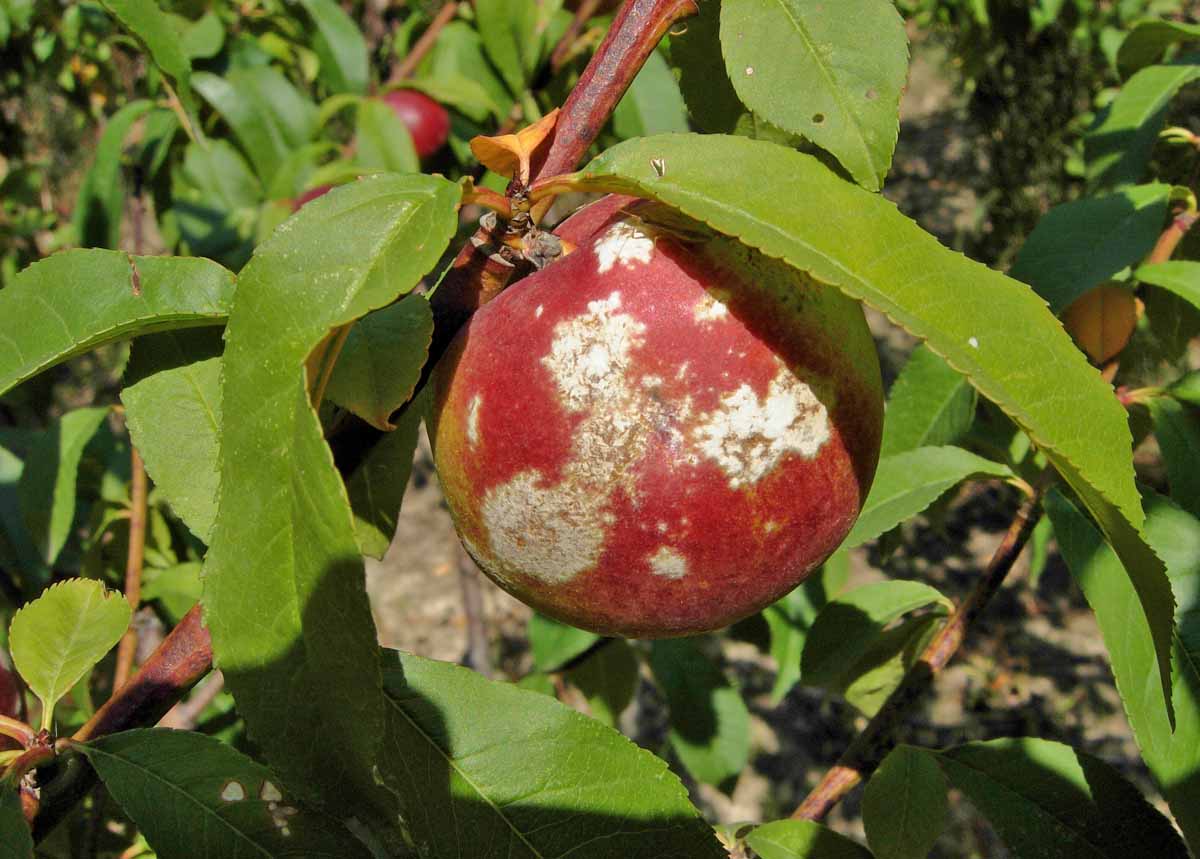 Při deštivém období se zvyšuje riziko poškození dozrávajících plodů peckovin moniliniovou hnilobou. Původcem choroby je vřeckatá houba Monilinia laxa a někdy i její úzce příbuzná Monilinia fructigena. Houby lze od sebe rozlišit i makroskopicky - M. fructigena mívá konidiofory s konidiemi uspořádány spíše v soustředných kruzích a napadá častěji jádrové ovoce, zatímco M. laxa je většinou patogenem peckovin a kupky konidií pokrývají roztroušeně celý plod.