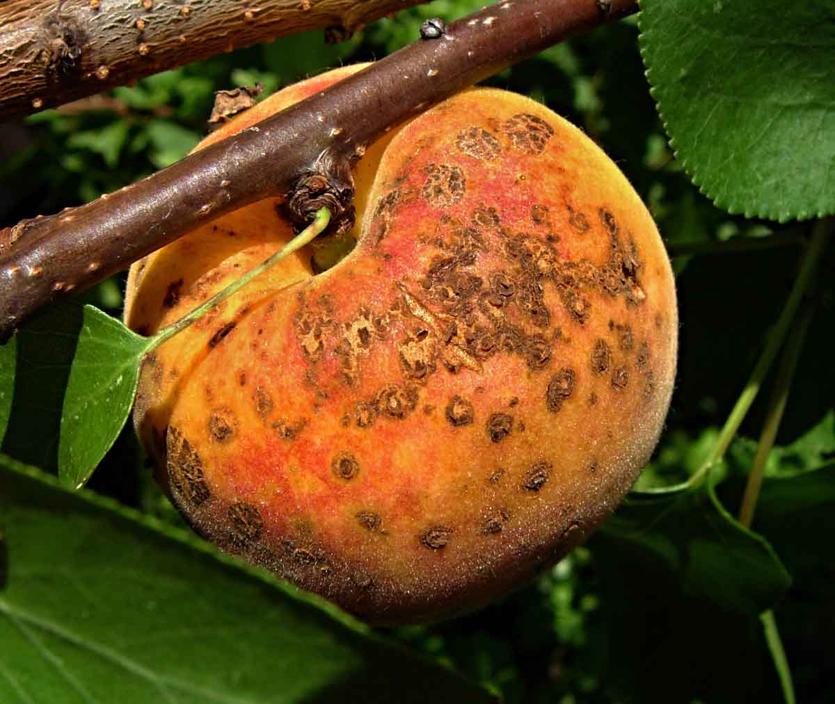 Na některých lokalitách se při vlhkém počasí mohou počátkem června objevit na meruňkách, především na plodech blízko stopky, šedohnědé skvrny. Nejvíce jsou napadány plody meruněk, ale i broskvoní a mandloní, ojediněle i slivoní. Způsobuje to houbová choroba strupovitost peckovin (Venturia carpophila). Choroba napadá zejména plody, ale také listy a letorosty. Nejčastěji bývají poškozeny plody v zahuštěných výsadbách a ve spodních částech severní strany koruny. Na plodech se vytvářejí (nejvíce až ve stadiu dozrávání) drobné (2 až 5 mm), okrouhlé, šedé až šedočerné skvrny, často s tmavším lemem. Počet skvrn se postupně zvětšuje, skvrny tmavnou, korkovatějí a při větším počtu se spojují v nepravidelné plochy. Skvrny jsou většinou lokalizovány v blízkosti stopky (na horní části plodů). Napadené plody nerostou, jsou deformované a často praskají a následně jsou napadány moniliniovou hnilobou. Choroba přezimuje na napadených větvích. Za vegetace se šíří konidiemi z napadených pletiv. Onemocnění se šíří především za deštivého a teplého počasí (optimum 25–30 °C). K infekcím dochází již 4.–6. týden po odkvětu, obvykle však až za deštivého počasí v průběhu června a července (meruňky) nebo července a srpna (broskve). Jednotlivé odrůdy jsou různě náchylné (z broskvoní především pozdní odrůdy). Napadení listů strupovitostí peckovin je jenom málo významné. Středy skvrn na listech hnědnou, usychají a mohou i vypadávat. Letorosty jsou poškozovány především u mandloní a broskvoní. Skvrny na letorostech jsou oválného tvaru.