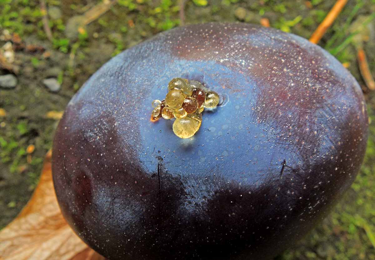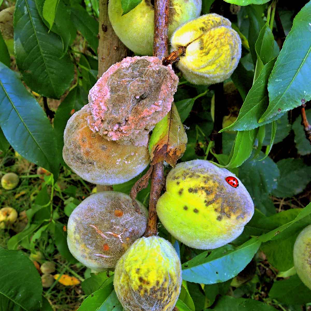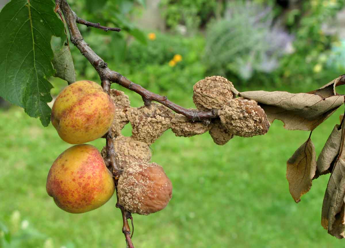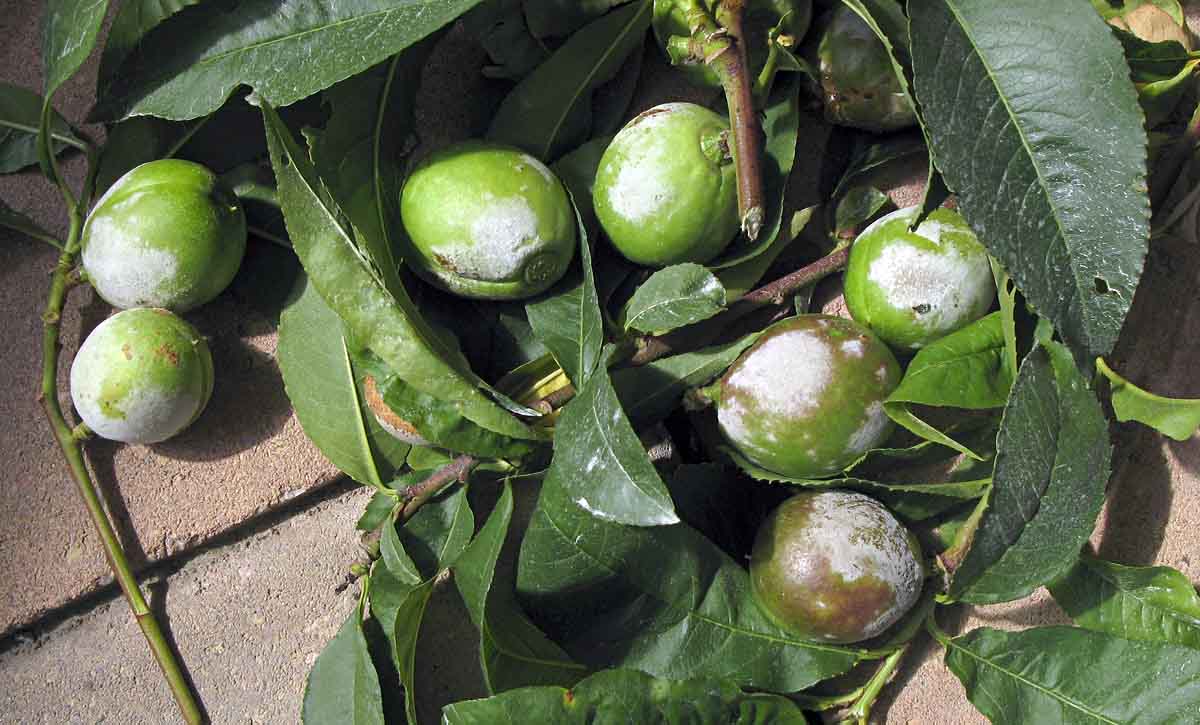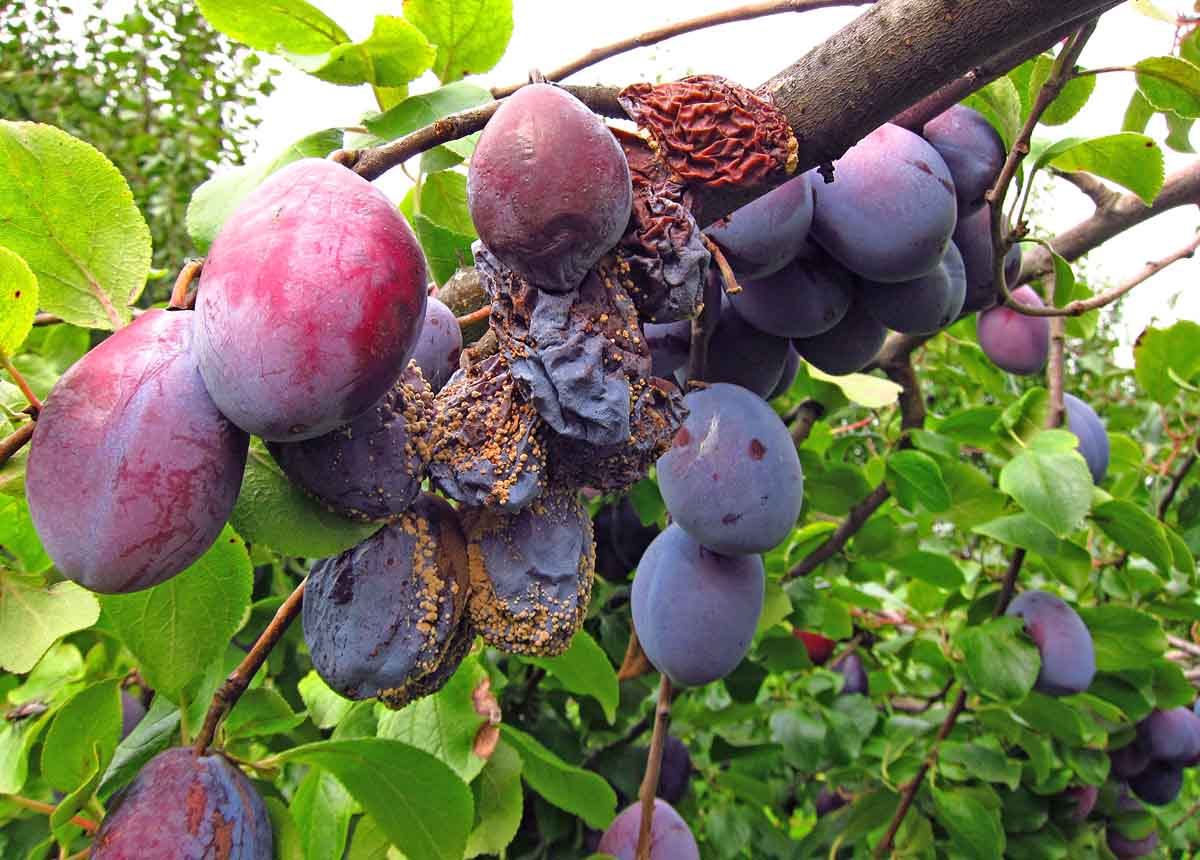Při deštivém období se zvyšuje riziko poškození dozrávajících plodů peckovin i jádrovin moniliovou hnilobou. Původcem choroby je vřeckatá houba Monilinia laxa a někdy i její blízce příbuzná Monilinia fructigena. Houby lze od sebe rozlišit i makroskopicky - M. fructigena mívá konidiofory s konidiemi uspořádány spíše v soustředných kruzích a napadá spíše jádrové ovoce, zatímco M. laxa je častěji patogenem peckovin a kupky konidií pokrývají roztroušeně celý plod.