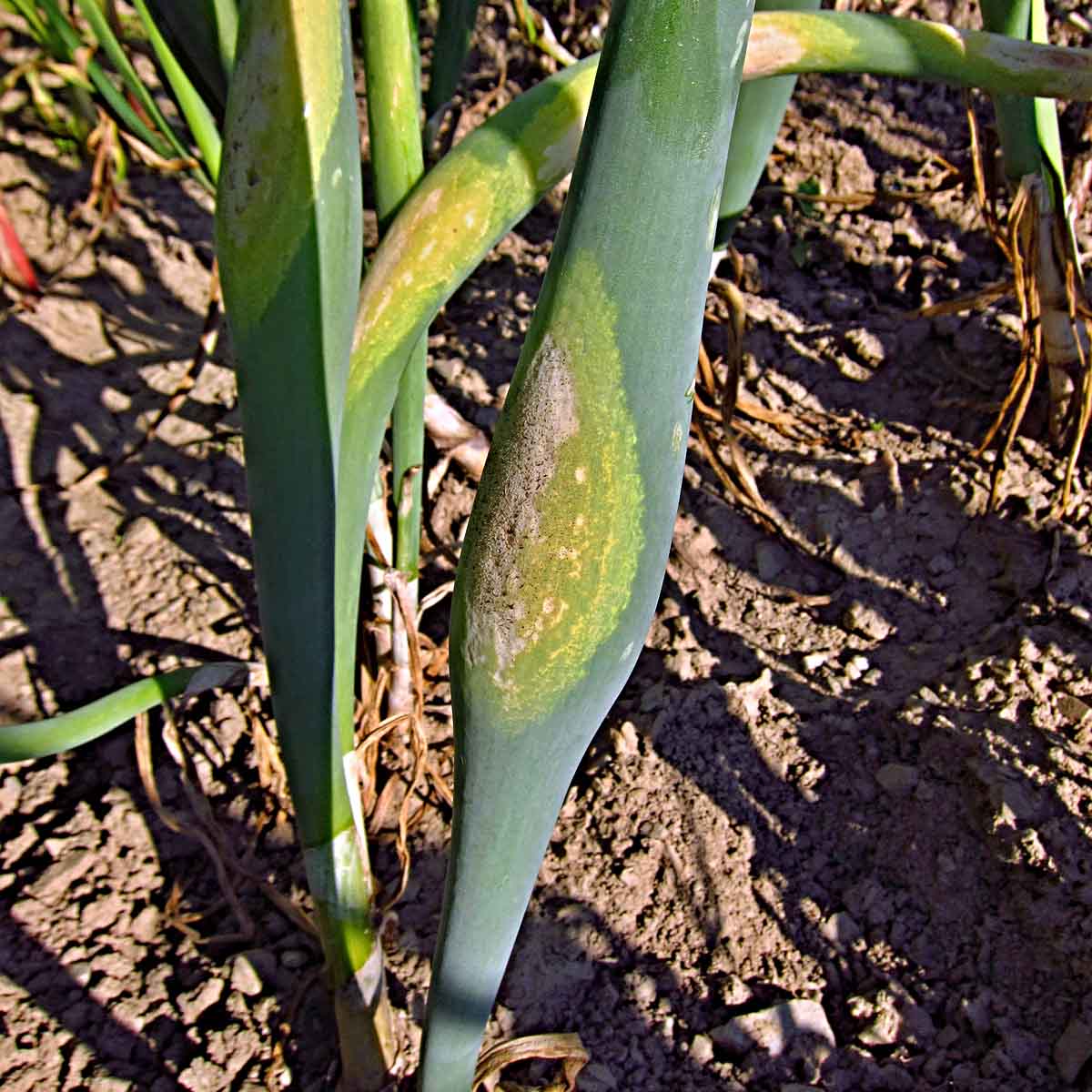 Obdobná situace je u plísně česnekovitých (plíseň cibulová; Peronospora destructor). Výskyt choroby podporuje teplejší počasí a počasí se střídavými teplotami mezi 5 až 23 °C, vysoká vzdušná vlhkost, rosy a dešťové srážky. Ošetřujeme v 7 až 14denních intervalech podle průběhu počasí a průběhu epidemie. V případě silného infekčního tlaku (při deštivém počasí) lze interval ošetření zkrátit. Povoleny jsou přípravky: Acrobat MZ WG, Dithane DG Neotec, Ortiva, Ridomil Gold MZ Pepite, Zakeo, případně i měďnaté přípravky: Defender, Flowbrix, Champion 50 WP, Kuprikol 250 SC. Pro zvýšení účinnosti se doporučuje přidat do postřikové jíchy smáčedlo. Podle metodiky možno preventivně aplikovat i biopreparát Polyversum.