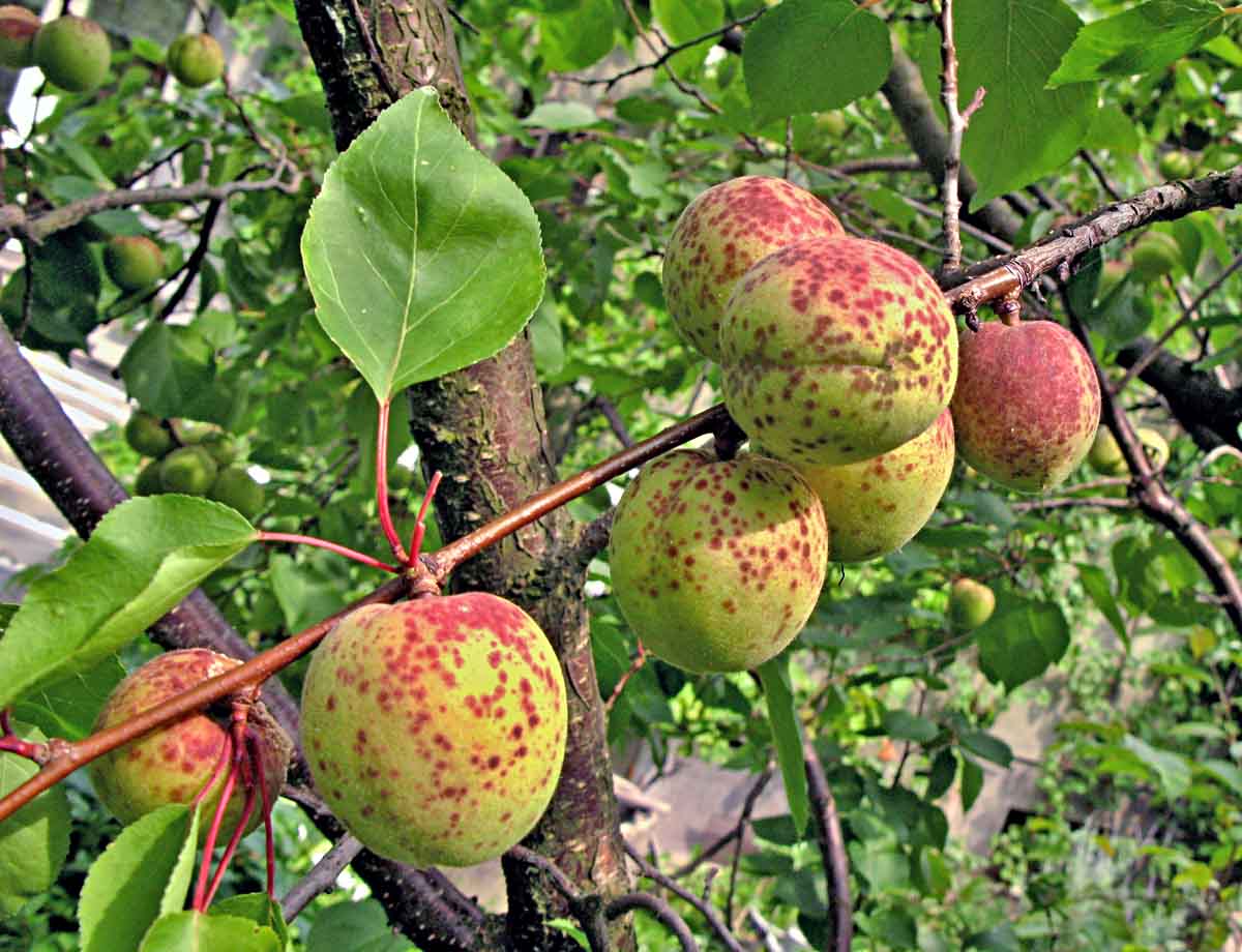 Na některých lokalitách se při vlhkém počasí mohou již počátkem června objevit na meruňkách, především na plodech blízko stopky, šedohnědé skvrny. Způsobuje to houbová choroba strupovitost peckovin (Venturia carpophila). Choroba napadá zejména plody, ale také listy a letorosty. Nejčastěji bývají poškozeny plody v zahuštěných výsadbách a ve spodních částech severní strany koruny. Nejvíce jsou napadány plody meruněk, broskvoní a mandloní, ojediněle i slivoní. Na plodech se vytvářejí (nejčastěji až ve stadiu dozrávání) drobné (2 až 5 mm), okrouhlé, šedé až šedočerné skvrny, často s tmavším lemem. Počet skvrn se postupně zvětšuje, skvrny tmavnou, korkovatějí a při větším počtu se spojují v nepravidelné plochy. Skvrny jsou většinou lokalizovány v blízkosti stopky (na horní části plodů). Napadené plody nerostou, jsou deformované a často praskají a následně jsou napadány moniliovou hnilobou. Choroba přezimuje na napadených větvích. Za vegetace se šíří konidiemi z napadených pletiv. Onemocnění se šíří především za deštivého a teplého počasí (optimum 25–30 oC). K infekcím dochází již 4.–6. týden po odkvětu, obvykle však až za deštivého počasí v průběhu června a července (meruňky) nebo července a srpna (broskve). Jednotlivé odrůdy jsou různě náchylné (z broskvoní především pozdní odrůdy). Napadení listů strupovitostí peckovin je většinou málo významné. Středy skvrn na listech hnědnou a usychají. Letorosty jsou poškozovány především u mandloní. Skvrny na letorostech jsou oválného tvaru.