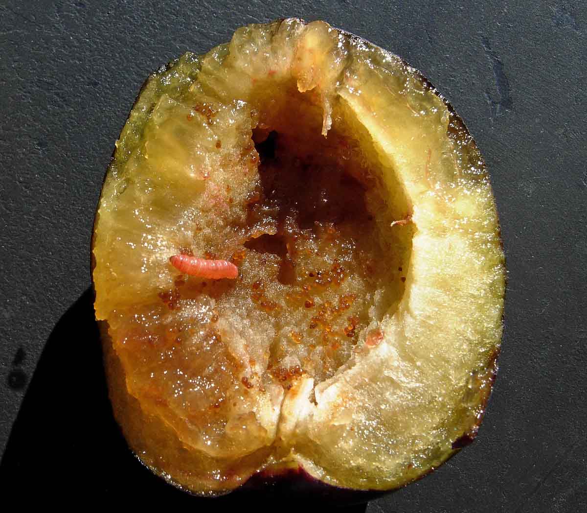 Obdobně ošetřete i slivoně proti červivosti způsobené obalečem švestkovým, jehož samečci nalétávají do feromonových lapačů podstatně více i za chladnějšího počasí a jeho letové vlny nejsou tak zřetelné jako u obaleče jablečného. Motýli druhé generace létají koncem července a počátkem srpna. Někdy se stává, že se období letu různých generací může i navzájem překrývat. Samičky kladou ve večerních hodinách vajíčka na mladé plody, ojediněle i na okolní listy. Vylíhlé housenky se několik minut pohybují po povrchu a poté se vžírají dovnitř plodů. Plody jsou měkčí a v plodu můžeme nalézt růžovou housenku a kousky tmavého trusu. Často plody mívají na povrchu, v místech, kudy vnikla housenka dovnitř, kapičky kleje. Červivé plody opadávají a za vlhkého počasí zahnívají. Proti druhé generaci se (dle návodu) doporučuje aplikovat povolené přípravky za týden po vrcholu první letové vlny, některé kontaktní přípravky však již v době vrcholu letové vlny.