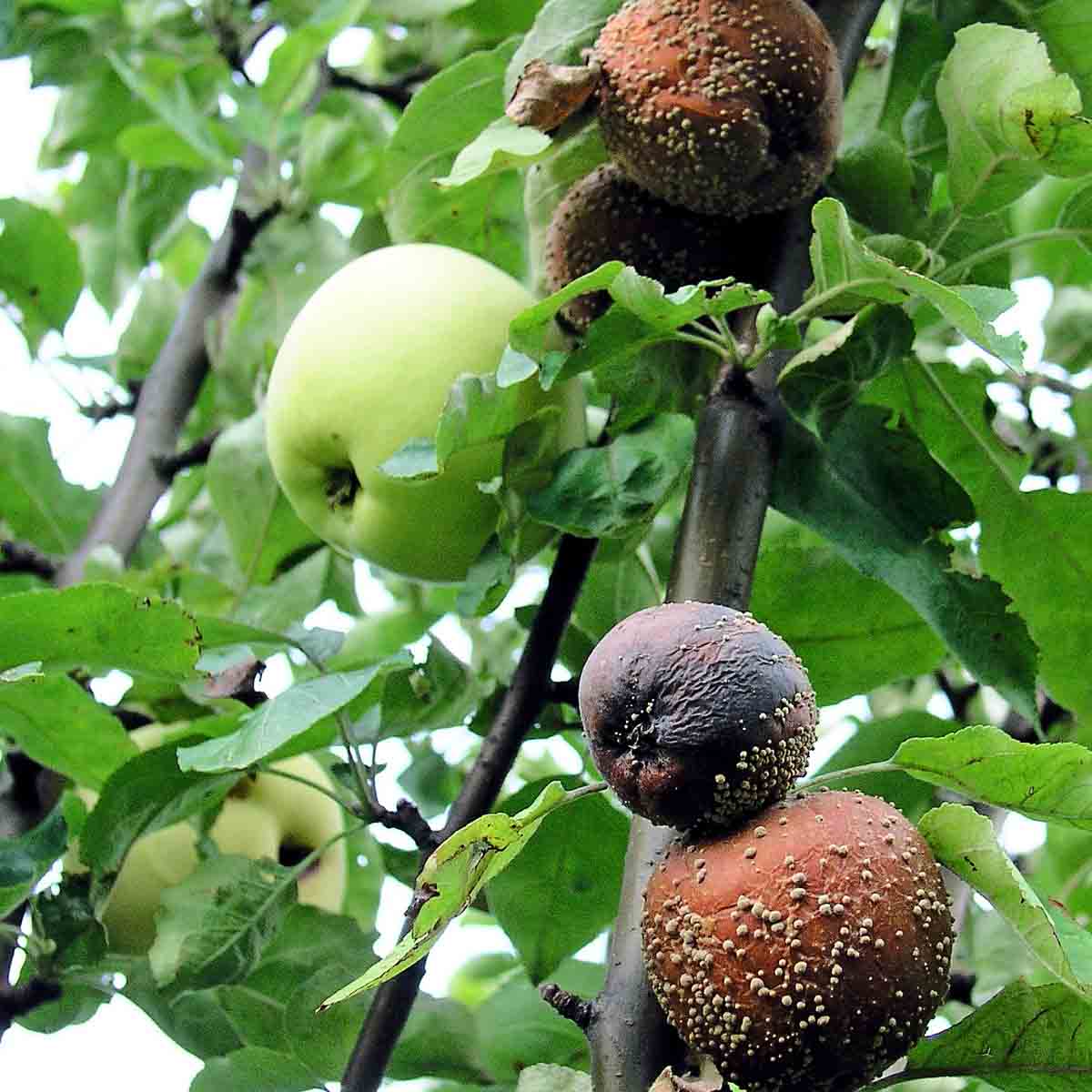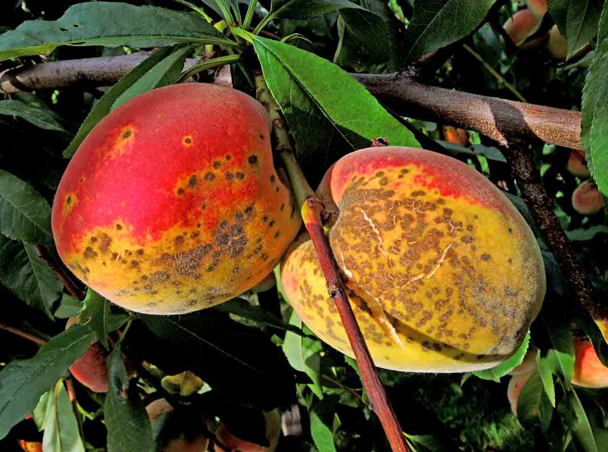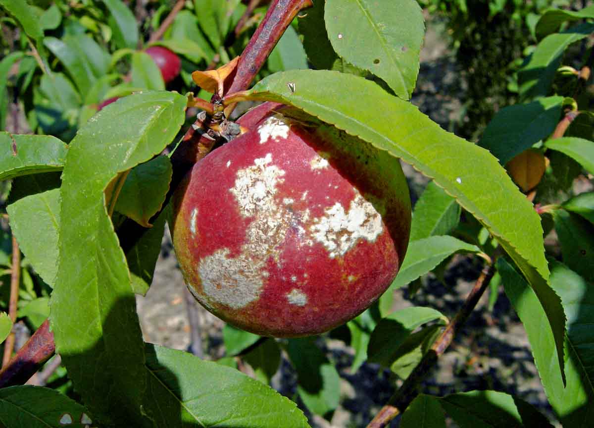 Při deštivém období se zvyšuje riziko poškození dozrávajících plodů peckovin i jádrovin moniliniovou hnilobou. Původcem choroby je vřeckatá houba Monilinia laxa a někdy i její blízce příbuzná Monilinia fructigena. Houby lze od sebe rozlišit i makroskopicky - M. fructigena mívá konidiofory s konidiemi uspořádány spíše v soustředných kruzích a napadá spíše jádrové ovoce, zatímco M. laxa je častěji patogenem peckovin a kupky konidií pokrývají roztroušeně celý plod.
