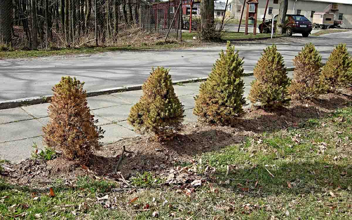 Hnědnutí a prosychání větví jehličnanů (na slunných stanovištích) může způsobovat i napadení sviluškami. V tomto případě aplikujte některý z akaricidů: Floramite 240 SC, Nissorun 10 WP či Vertimec 1.8 EC