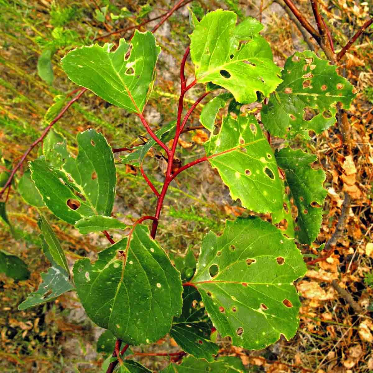 Suchá skvrnitost listů se na listech projevuje vznikem až 5 mm velkých fialovočervených až červenohnědých skvrn s tmavým okrajem. Později skvrny nekrotizují a nekrotické pletivo vypadává. Příznaky napadení lze zaměnit i s poškozeními způsobenými listožravými škůdci.