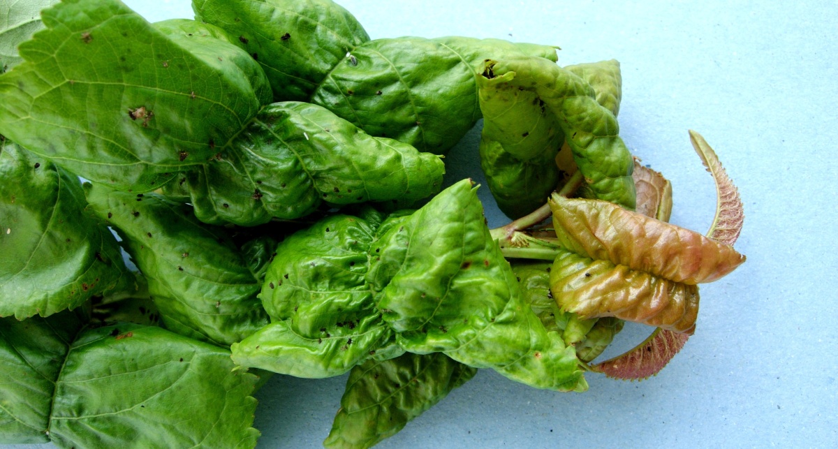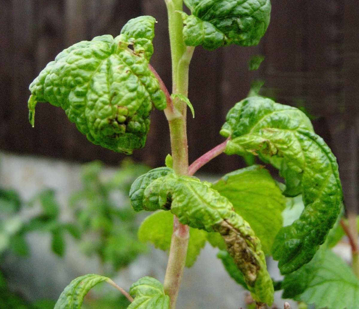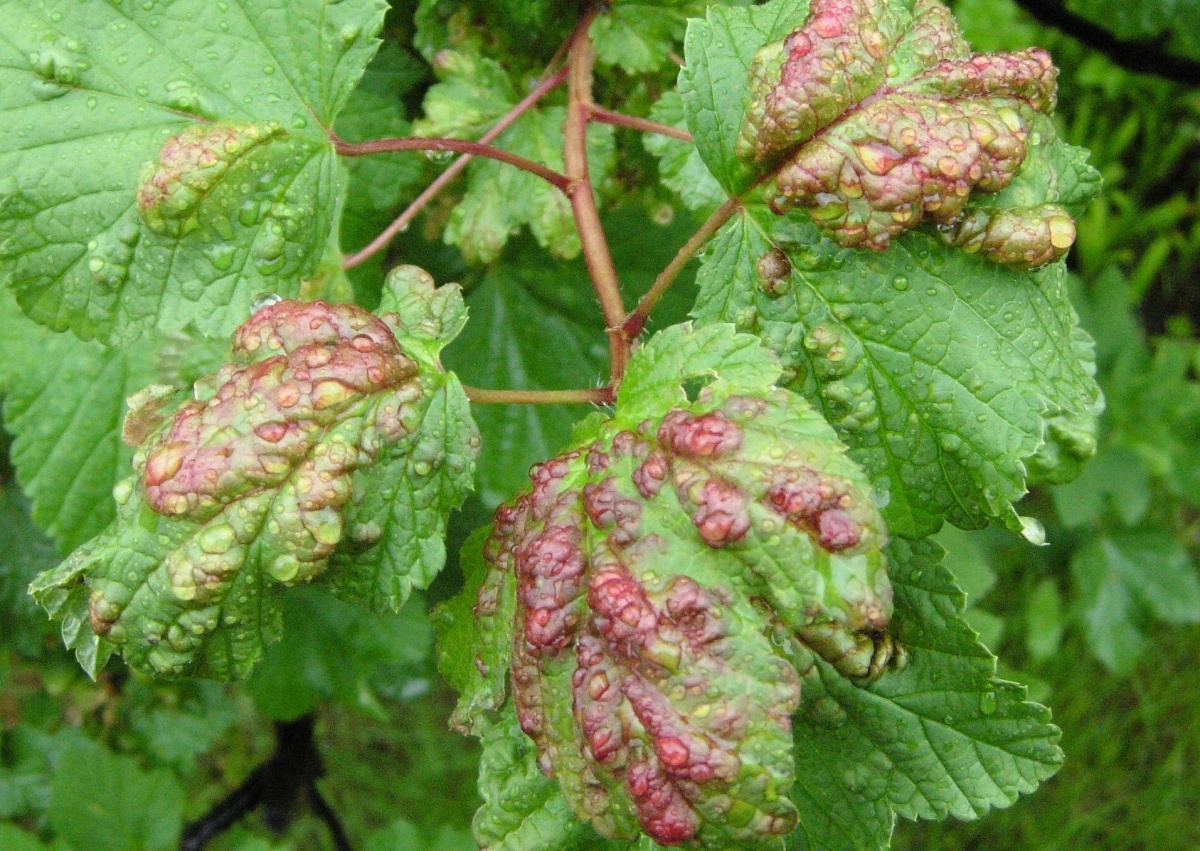 Poškození listů černého rybízu mšicí rybízovou