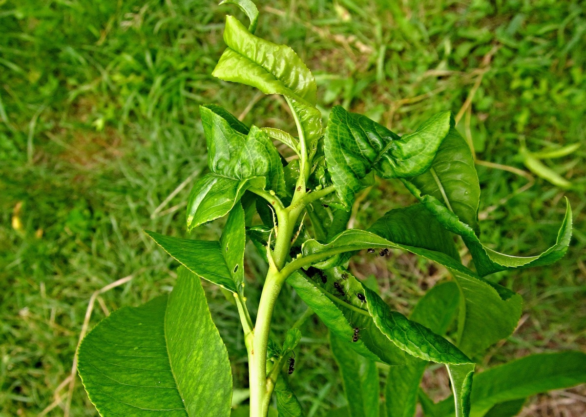 Svinování listů broskvoně mšicí hnízdotvornou