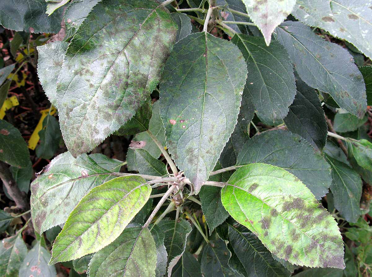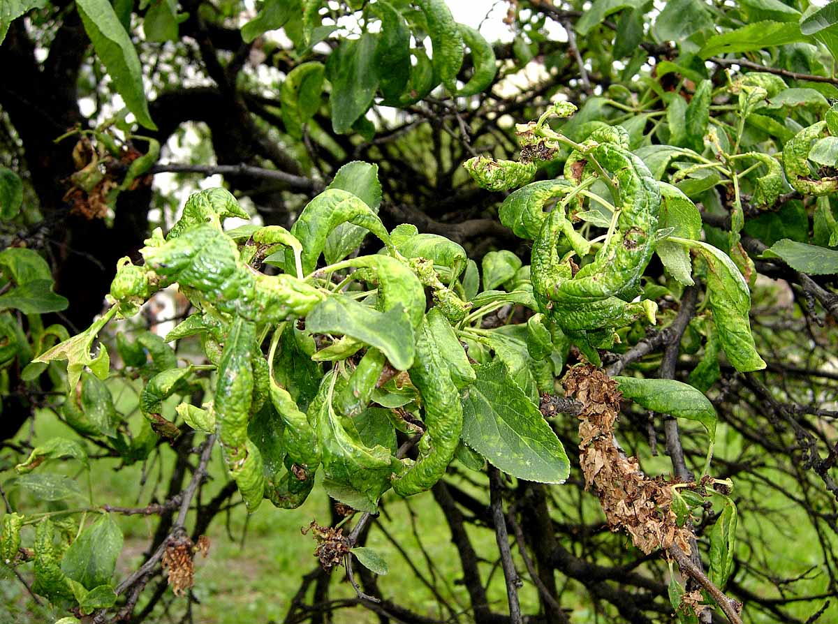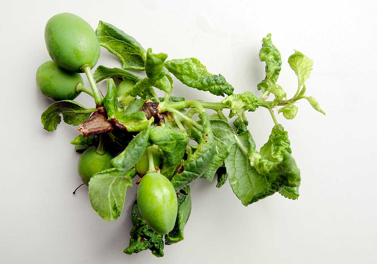 Poškození listů švestky sáním mšic