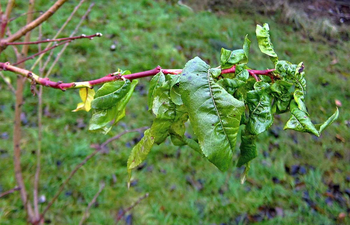 Napadené listy broskvoně mšicí hnízdotvornou