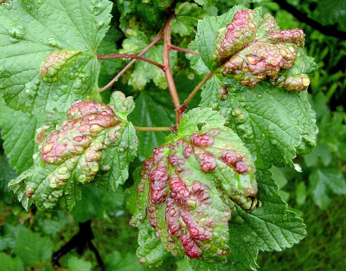 Příznaky napadení listů červeného rybízu mšicí rybízovou