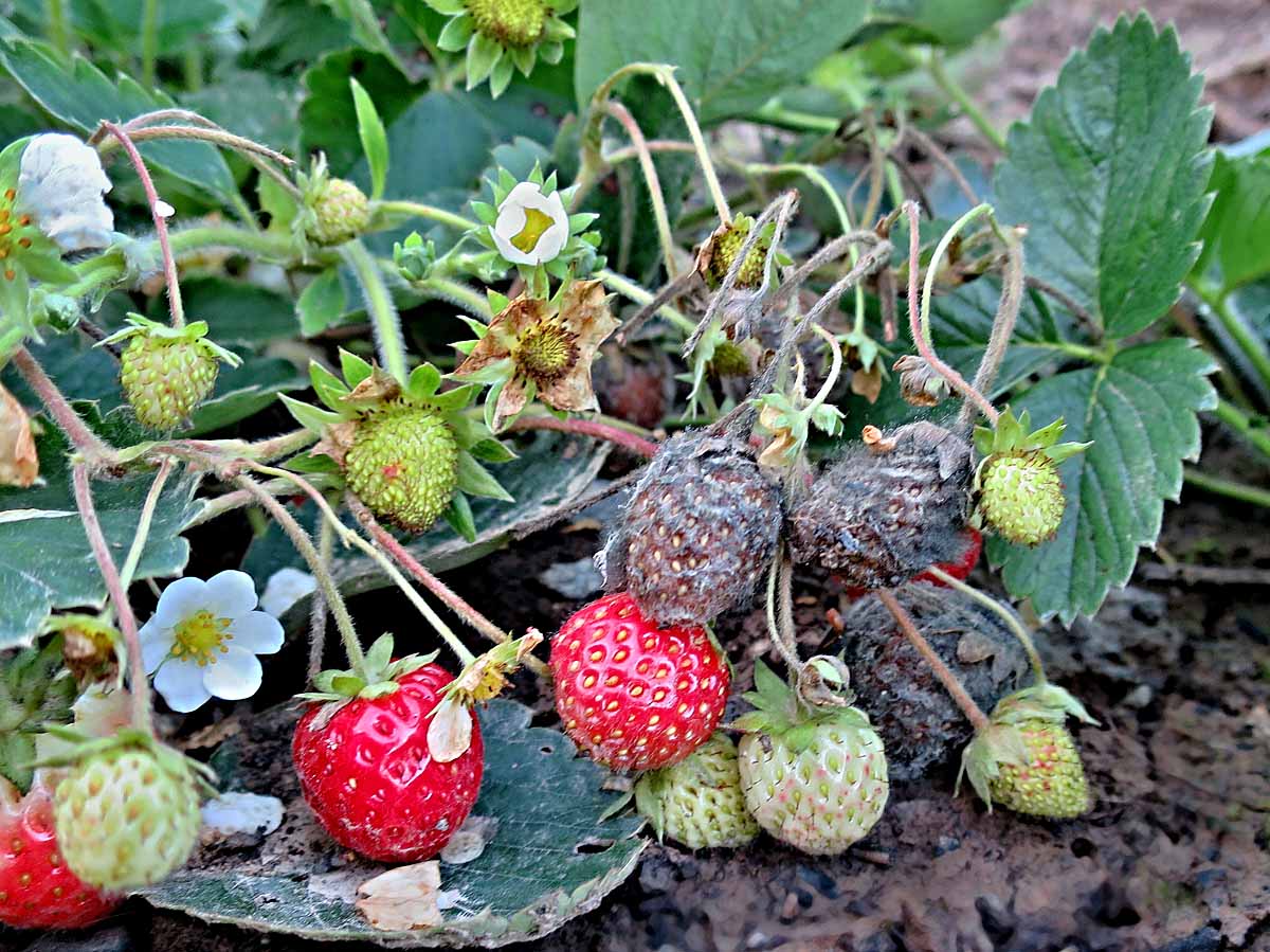 Zvláště na uzavřených zavlažovaných plochách je předpoklad výskytu šedé hniloby jahod (plíseň šedá; Botrytis cinerea). Choroba se šíří především za deštivého a teplejšího počasí. O napadení rozhoduje především počasí a dále mikroklima lokality, stav porostu a náchylnost odrůdy. Odolné odrůdy jsou např.: Honeoye, Darselect, Kimberly, Florence, Tenira, Symphony, Elkat, Induka, Korona, Polka aj. Nejcitlivější k infekci jsou květy 2 až 3 dny po rozkvětu. Z napadených květních částí proniká mycelium do plodu. Přímé infekce plodů jsou již méně významné.