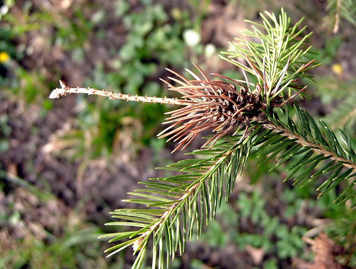 Poškození výhonku smrků mšicí korovnicí