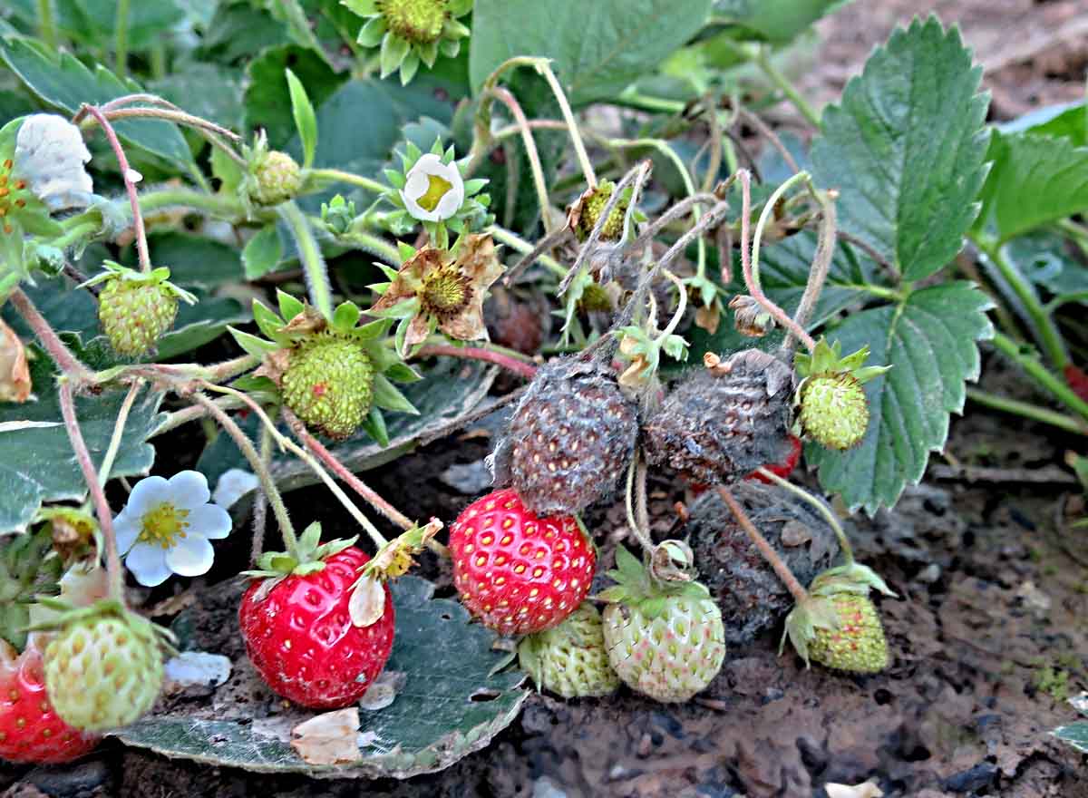 Zvláště na uzavřených zavlažovaných plochách je předpoklad výskytu šedé hniloby jahod (plíseň šedá, Botrytis cinerea). Choroba se šíří především za deštivého a teplejšího počasí. O napadení rozhoduje především počasí a dále mikroklima lokality, stav porostu a náchylnost odrůdy. Odolnější odrůdy jsou např.: ´Honeoye´, ´Darselect´, ´Kimberly´, ´Florence´, ´Tenira´, ´Symphony´, ´Elkat´, ´Induka´, ´Korona´, ´Polka´ aj. Nejcitlivější k infekci jsou květy 2 až 3 dny po rozkvětu. Z napadených květních částí proniká mycelium do plodu. Přímé infekce plodů jsou již méně významné.